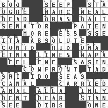 ACROSS 1. Oct. 31 cry 4. Ooze 8. R.R. building 11. Legendary monster 13. Drug cop 14. Actress Patricia 15. Necklace unit 16. Mouths or openings 17. Indonesian resort city 18. Legislator 21. Eucharist need 22. Greater amount 23. Double-curved letter 25. Compass dir. 26. Call ___ day 29. Utter; complete 32. Continued (abbr.) 34. To free from 35. Heredity factor (abbr.) 38. Inactive volcano in Sicily 39. Citrus fruits 41. California wine valley 43. Snakelike fish 44. Compass dir. 45. Indian antelope 46. Meet 50. Bit 51. _ Lanka 54. Wedding promise 55. Oceans 57. Lessep's creation 59. Borne 63. Of or related to the anus 64. Silent film actress Nazimova 67. In an inward manner 68. Undesirable depression on a surface 69. Letter starter 70. Comedian Laurel of Laurel & Hardy 71. Observe 72. Claim 73. Single DOWN 1. Moves up and down 2. Double curve, resembling the letter S 3. NW Algerian seaport 4. Sounds asleep 5. Ewer handle 6. Epoch 7. Personal Computers (abbr.) 8. Theater features 9. Stories 10. Place in a line 12. Dutch treat 14. Basketball assoc. 19. Frog relative 20. Globe 21. Pacific Standard Time (abbr.) 23. Writer Wiesel 24. Beer foam 26. Frozen water 27. Carry 28. Singer Murray 30. Channel Islands abalone 31. Pulitzer Prize-winning author Ferber 33. Baby powder 36. Political cartoonist Thomas 37. Capital of Western Samoa 39. Grant temporary use of 40. A message received and understood 42. Added to 45. Play the lead 47. Lubricate 48. Motion picture awards 49. Teachers' org. 51. Heaps 52. Indian princess (variant) 53. Silly 56. Indian titles of respect 58. Keyboard modifier key 60. To the inside or interior of 61. Liveliness 62. Unit of force 64. Find the sum of 65. Luau accessory 66. Experiment locale