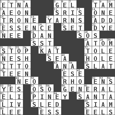 ACROSS 1. Inactive volcano in Sicily 5. Set 8. Scottish cap 11. Period of immesurable duration 12. Indian titles of respect 14. Single 15. Heavy duty weighing machine 17. Entertaining tales 18. Say or write further 19. Center 21. Put into a specified state 22. Color 23. Born 24. Daniel's nick name 25. Mayday 27. Fast jet (abbr.) 28. Smallest unit of an element 31. Halt 35. Krazy ___ of comics 37. Lacquered or enameled metalware 38. Soft 39. Ocean 41. Opening into or through something 42. "Tell ____ the Marines!" 43. Santa ___, CA 45. Narrow board 46. Adolescent 47. Compass dir. 49. Modern: prefix 51. 17th letter of the Greek alphabet 52. Followers of ems 55. Affirmative reply 57. Bear (Spanish) 60. Commissioned military rank 62. Biblical high priest 63. Abounding in pines 65. Before Barbara or Clara 66. 54 in ancient Rome 67. Downhill vehicle 68. Thailand, formerly 69. Area sheltered from the wind 70. Double-curved letter 71. Snakelike fish DOWN 1. Ingested 2. Laconic 3. Trap for birds or small mammals 4. Queen of England 1702-14 5. Girls' org. (abbr.) 6. Blunders 7. Actor's bit 8. Inedible or poisonous agaric 9. Actor Griffith 10. Ancient Persian 13. Fast planes 16. Extremities 17. Gossips 20. Keg 26. Curses 29. Water jar 30. Rendezvous 31. In a ____ (agitated or irritated) 32. Wig 33. Clearly or manifestly demonstrative 34. Give a jingle 36. Afternoon social gathering 40. Disorder of the immune system 44. American tennis player Robert 48. Immeasurably long periods of time 50. I made a mistake 52. Bert's buddy 53. Relating to or accompanying birth 54. Shuts with force 55. Shout 56. Writer Wiesel 58. Filth; sediment 59. Washington bills 61. Comfort 64. Begley and Asner