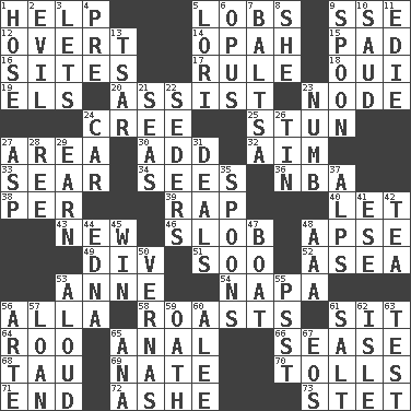 ACROSS 1. Aid 5. Tennis shots 9. Compass dir. 12. Unconcealed 14. Brightly colored fish 15. Groovy apt. 16. Locates 17. General guideline 18. Fr. "Yes" 19. Raised railways 20. Help 23. Connecting point 24. Algonquian 25. Surprise greatly 27. Length times width 30. Increase 32. Direct toward a target or goal 33. Singe 34. Perceives with the eye 36. Basketball assoc. 38. For each 39. Strike 40. Allow 43. ___ Haven, CT 46. Messy guy 48. Domed church section 49. HTML Container Element 51. "Barney Miller" actor Jack 52. At sea 53. Queen of England 1702-14 54. California wine valley 56. Silent film actress Nazimova 58. Ridicules or criticizes harshly 61. Be seated 64. Friend of Pooh 65. Of or related to the anus 66. Gospel singer Marvin 68. The 19th letter of the Greek alphabet 69. Nathan's nickname 70. For Whom the Bell _____ 71. Conclusion 72. American tennis player Robert 73. Proofreading order DOWN 1. Flexible conduit 2. Tending to cause great harm 3. Allows 4. Before (prefix) 5. Australian parrot (variant) 6. Musical composition 7. Greek mezzo-soprano Agnes 8. A female animal or person 9. Soup utensil 10. Saudi Arabian king (1953-1964) 11. Singer Brickell 13. Russian ruler of old 21. Oceans 22. Spring feasts 23. Unfeeling 24. Automobile 26. Shallow baking pan 27. Cleo's killer 28. To separate or throw off 29. Merit 31. Allots cards 35. Soup utensils 37. High mountains 41. Compass dir. 42. Afternoon social gathering 44. Pulitzer Prize-winning author Ferber 45. Acquire through effort 47. Water vessel 48. Auto club (abbr.) 50. Actresses Bloom and Felton 53. Verbally 55. Inconspicuous attention getter 56. Johnson of "Laugh-In" 57. Grant temporary use of 59. Pledge 60. Toward shelter 61. Table seasoning 62. Capri or Wight 63. Trial 65. Santa ___, CA 67. Greek goddess of the dawn