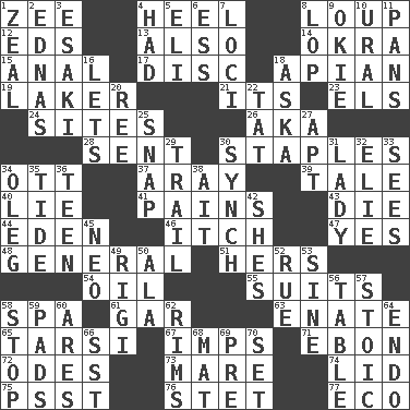 ACROSS 1. Last letter of the English alphabet 4. Person who is morally reprehensible 8. Central Nebraska county 12. Begley and Asner 13. In addition 14. Gumbo ingredient 15. Of or related to the anus 17. Flat circle 18. Bee-related 19. Member of a famous L.A. basketball team 21. It is 23. Raised railways 24. Settings 26. Alias (abbr.) 28. Emitted 30. Paper fasteners 34. Baseball player Mel 37. Like ___ of sunshine 39. Falsehood 40. Falsehood 41. Aches 43. Expire 44. Genesis locale 46. Hankering 47. Affirmative reply 48. Commissioned military rank 51. Possessive pronoun 54. Petroleum 55. Costumes for special activities 58. Health resort 61. Slender fish 63. Related on the mother's side 65. Tarsus (plural) 67. Naughty children 71. Inky black, to poets 72. Lyric poems 73. Female horse 74. Flaplike covering 75. Inconspicuous attention getter 76. Proofreading order 77. Environmental prefix DOWN 1. Ardor 2. Ferber et al. 3. 1973 Nobel Price Winner (Physics) Leo 4. Possessed 5. Connecticut Ivy Leaguer 6. Double-curved letter 7. Event scenes 8. Trim (branches) 9. Migrant worker of the '30s 10. Mountain range 11. Baking dishes 16. Allows 18. "____ silly question..." 20. To riddle 22. Make lace 25. Fastener 27. Fitting 29. Get behind 30. Synchronize (abbr.) 31. Kenny Rogers chart-topper in '80 32. Writer Wiesel 33. Perceives with the eye 34. Cassini of fashion 35. Periodic rise and fall of the sea level 36. Adolescent 38. Small island 42. "______ My Girl" (Turtles hit) 45. Modern: prefix 49. Swiss mountan, "Queen of the Mountains" 50. Chicken ___ king 52. Regret 53. Trig term 56. Eating place 57. Unemotional 58. Discontinue 59. Writing tablets 60. Ancient Greek god of war 62. Basketball hoops 64. Inside; within (prefix) 66. Fast jet (abbr.) 68. Floor protector 69. Before (prefix) 70. Put into a specified state
