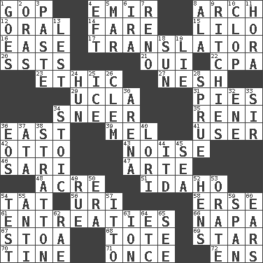 ACROSS 1. Republican Party 4. Arab leader 8. Bowlike part 12. Taken by mouth 14. Conductor's collection 15. _ and Stitch 16. Comfort 17. Interpreter 20. Fast planes 21. Fr. "Yes" 22. Accounting whiz (abbr.) 23. Moral principle 27. Soft 29. Southern CA. univ. 31. Sliced desserts 34. Contemptuous expression 35. Painter Guido (1575-1642) 36. 90 degrees 39. Cartoonist voice _ Blanc 41. One who makes use of a thing 42. Von Bismarck 43. Annoying sound 46. Indian skirt 47. Johnson of "Laugh-In" 48. 43,560 square feet 51. Potato state 54. Make lace 56. RI univ. 58. Celtic language 61. Pleas 66. California wine valley 67. Portico 68. Lug 69. Play the lead 70. Prong on a fork 71. Single time 72. Followers of ems DOWN 1. Moves 2. Mouths or openings 3. Thick mixture 4. Lizard (obsolete) 5. Impair 6. Retirement account (abbr.) 7. Western Nevada city 8. Insect wing 9. Actors Guy, Robert Welles, and Clint 10. Hoof sound 11. Israeli folk dance 13. For fear that 18. Player for Phoenix 19. Falsehood 24. Attila the _ 25. Frozen water 26. Clement's nick name 28. Disorder 30. Sports stadium 32. Compass dir. 33. Title for a knight 34. Unemotional 36. Greek goddess of the dawn 37. "One Day ___ Time" 38. Ski resort town in Vermont 40. Australian parrot (variant) 44. It would 45. Ocean 49. Sorrow 50. Period 52. Coop moms 53. Declaim 54. Trial 55. Against 57. "Tell ____ the Marines!" 59. Connect, as a bridge 60. Hearing organs 62. Actress Charlotte 63. Electrically charged atom 64. And so on (abbr.) 65. Observe