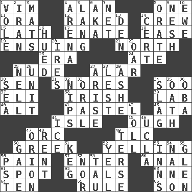 ACROSS 1. Zeal 4. Actor Alda or Thicke 8. Single 11. Mouth or opening 12. Moved through 14. Group working together 15. Thin strip of wood or metal 17. Related on the mother's side 18. Relaxation 19. Following as a consequence or result 21. Compass direction 23. Period 24. Had dinner 25. Naked 27. Having or resembling wings 30. Elected rep. 31. Sounds asleep 34. "Barney Miller" actor Jack 37. Connecticut Ivy Leaguer 38. From or relating to Ireland 39. Experiment locale 40. The first octave above the treble staff 41. Soft color 43. _ moment's notice (2 wds.) 44. Capri or Wight 45. Ending for "Through" and "Enough" 47. The grampus (Milton) 49. Affectionate concern, for short 50. Hellenic 52. Crying or shouting loudly 56. Ache 57. Keyboard key 60. Of or related to the anus 61. Specific locale 62. Purposes of endeavors 63. Compass dir. 64. "___ Little Indians" 65. Governing power 66. Male offspring DOWN 1. Short-tailed, large-bodied rat 2. SW Asia republic 3. Floor coverings 4. Sports stadium 5. Long (Scottish) 6. Alias (abbr.) 7. Fish or hair follower 8. Declaim 9. Soft 10. She-sheep 13. Lair 14. Certainty 16. Became colored 20. Angers 22. Rowing implement 25. 1994 drama film starring Jodie Foster 26. A single undivided whole 27. Originate 28. For fear that 29. American tennis player Robert 30. Ocean 32. Pinches, bites 33. Taken by mouth 34. Volcanic refuse 35. Pledge 36. Chief or king in Benin or Nigeria 42. Hang loosely or laxly 44. Frozen water 46. Southern CA. univ. 47. Greek mythologigal hunter 48. Monthly bill 49. Laconic 50. Yawn 51. Cask 52. Shout 53. Taverns 54. Billionth: prefix 55. Small, secluded valley 56. Pacific Standard Time (abbr.) 58. Not either 59. The 19th letter of the Greek alphabet