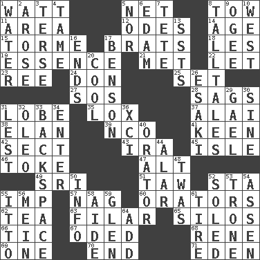 ACROSS 1. Electrical Unit 5. Fish or hair follower 8. Pull behind 11. Type of rug 12. Lyric poems 14. Grow older 15. Singer Mel 17. Naughty children 18. French article 19. Substance 21. Was introduced to 22. Allow 23. To sift 24. Spanish title 25. Put into a specified state 27. Mayday 28. Settles 31. Ear part 35. Brine-cured salmon 37. Mountain range southwest of Kyrgyzstan 38. Liveliness 39. Non-commissioned officer (abbr.) 41. Peachy ____! 42. Religious group 43. Retirement account (abbr.) 45. Capri or Wight 46. Casino tip 47. Keyboard modifier key 49. _ Lanka 51. The 23rd letter of the Hebrew alphabet 52. R.R. building 55. Mischievous child 57. Tired old horse 60. Speakers 62. Beverage made from leaves 63. Having threads 65. Grain storage towers 66. Nervous spasm 67. Wrote a lyric poem 68. French philosopher Descartes 69. Single 70. Conclusion 71. Genesis locale DOWN 1. Wetness 2. Came up 3. Laconic 4. Not wild 5. And not 6. Dutch treat 7. Wig 8. Baron Munchausen's specialties 9. Double curve, resembling the letter S 10. 270 degrees 13. Fast planes 16. Extremities 17. Gillaume's butler role 20. Calm and collected 26. 1973 Nobel Price Winner (Physics) Leo 29. Highlander 30. Trig term 31. For fear that 32. Margarine 33. Keyboard key 34. Keyboard key 36. One more than ninety 40. Speaker 44. Having or resembling wings 48. It was, poetically 50. A message received and understood 52. Having a sole or soles 53. Marketplace scale 54. NE Netherlands city 55. "Tell ____ the Marines!" 56. Count _ (2 wds.) 58. Helper 59. Small, secluded valley 61. Hoop that covers a wheel 64. Increase