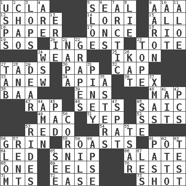 ACROSS 1. Southern CA. univ. 5. Lick closed 9. Auto club (abbr.) 12. Dinah or Pauly 14. Australian parrot (variant) 15. 100% 16. Some stationery 17. Single time 18. _ de Janeiro 19. Mayday 20. Eat 23. Carryall 24. Erode 25. Visual representation of an object 27. Small amounts or degrees 30. Infant food 32. Head covering 33. Afresh 34. Capital of Western Samoa 36. John Ritter's dad 38. Sound made by sheep 39. Followers of ems 40. Atlas unit 43. Strike 46. Arranges properly for use 48. Ketch in the Levant 49. Apple computer (short form) 51. Slangy assent 52. Fast planes 53. Do over again 54. Pace 56. Broad smile 58. Cooks with dry heat, as in an oven 61. Cooking vessel 64. Directed 65. Sever or remove by pinching or nipping 66. Having winglike extensions 68. Single 69. Snakelike fish 70. Musical pauses 71. Mountains (abbr.) 72. Relaxation 73. Guess DOWN 1. United States Postal Service (abbr.) 2. US Secretary of Labor Elaine L. _ 3. Chops off 4. "We ___ not amused" (Victoria) 5. A type of plum 6. Immeasurably long periods of time 7. Northern region 8. Falsehood 9. Composer Copland 10. Set down 11. _ vera 13. 4th largest of the Great Lakes 21. California wine valley 22. Wine fruits 23. Drink excessively 24. Compass dir. 26. Krazy ___ of comics 27. Bar bill 28. Santa ___, CA 29. Letter starter 31. Abounding in pines 35. Michaelmas daisies 37. Dec. holiday 41. Small island 42. Personal Computers (abbr.) 44. So be it 45. Writing tablet 47. Petty quarrel 48. Compass dir. 50. Pupil covering 53. Amusement-park features 55. Russian ruler of old 56. Seize upon or latch onto something 57. Monthly bill 59. Lubricates 60. Domed church section 61. Romantic infatuation 62. Von Bismarck 63. Trial 65. Observe 67. French article