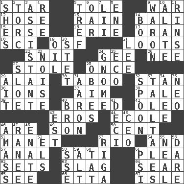 ACROSS 1. Play the lead 5. Lacquered or enameled metalware 9. Armed conflict 12. Flexible conduit 13. Water falling in drops from the sky 14. Indonesian resort city 15. Celtic language 16. 4th largest of the Great Lakes 17. NW Algerian seaport 18. _-fi 19. Order of Saint Francis (abbr.) 21. Plunders 22. In a ____ (agitated or irritated) 24. Unit of force equal to gravity 26. Born 27. Fur scarf 28. At one time in the past 29. Jai _ 30. Off limits 32. Comedian Laurel of Laurel & Hardy 36. Charged atoms 37. Direct toward a target or goal 38. Diluted with white 39. False hair 40. A special lineage 42. Butter sub 43. Greek god of love 44. Learning spot: Fr. 46. "We ___ not amused" (Victoria) 49. Manchild 50. Penny 51. French painter Edouard 53. River (Sp.) 54. Added to 57. Of or related to the anus 58. Suttee (variant) 61. Entreaty 62. Puts into a specified state 63. Volcanic refuse 64. Burn superficially 65. Perceive with the eye 66. Singer James 67. Small island DOWN 1. "______ My Girl" (Turtles hit) 2. Torque (variant) 3. Helper 4. To separate or throw off 5. Not kosher 6. Boat paddle 7. Cards in a Roman deck? 8. Compass dir. 9. Make _____ (do battle with) 10. Having winglike extensions 11. Wash lightly 14. Sometimes accompanies a hiss 19. Petroleum 20. Proofreading order 21. Area sheltered from the wind 23. Annoying sound 24. Dwarf 25. Environmental prefix 27. A type of plum 28. Off-Broadway awards 29. Small island 31. Composer Copland 32. Soup utensil 33. Baron Munchausen's specialties 34. Toward shelter 35. Modern: prefix 40. Sis' sibling 41. Tenth: prefix 43. Eastern Standard Time (abbr.) 45. Corporate head (abbr.) 46. Collect or gather 47. The wife of a rajah (variant) 48. Related on the mother's side 52. Raised railways 53. Capital of Latvia 55. Anneal 56. Have the gumption 58. Compass dir. 59. The first octave above the treble staff 60. Make lace 61. Air pressure measure (abbr.)