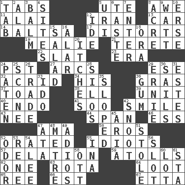 ACROSS 1. Bar bills 5. Shoshoni 8. Deep reverence 11. Jai ____ 12. SW Asia republic 13. 4-wheeled motor vehicle 14. Greek mezzo-soprano Agnes 17. What propaganda does 19. Ear of corn 21. Cylindrical with tapered ends 22. Narrow board 23. Epoch 24. Pacific Standard Time (abbr.) 27. Curves 29. Compass dir. 32. Bitter 34. Part of HMS, perhaps 36. Pate de foie ____ 37. Frog relative 38. Pipe bend 39. A single undivided whole 40. Inside; within (prefix) 41. "Barney Miller" actor Jack 42. Grin 43. Born 44. Connect, as a bridge 46. Double-curved letter 47. Wet nurse (var.) 50. Greek god of love 52. Declaimed 55. Foolish or stupid persons 57. Accusation by an informer 59. Ringlike coral islands and reefs 62. Single 63. Round or rotation of duties 64. Plunder 65. To separate or throw off 66. Eastern Standard Time (abbr.) 67. Singer James DOWN 1. Keyboard key 2. In the manner of 3. Lip ointment 4. Settings 5. RI univ. 6. Clothes sense 7. Keyboard key 8. Land measure 9. Electrical Unit 10. Celtic language 12. Binary compound 15. First course 16. Having or resembling wings 18. Mouth or opening 20. Strong, restless desires 24. Eucharist need 25. Biscuitlike quick bread 26. Swap 28. Grain storage towers 29. Bert's buddy 30. Travels by water 31. _____ Park, CO 33. Wedding promise 35. Inclined 36. Chewing product 42. Snob 45. Operatic vocal solo 47. _ moment's notice (2 wds.) 48. Distance measurement (Brit.) 49. Goodbye (Sp.) 51. Fur scarf 52. Scent 53. French philosopher Descartes 54. Toward shelter 55. _ tizzy (2 wds.) 56. Slit 58. Baseball player Mel 60. Car dealer's back yard 61. R.R. building