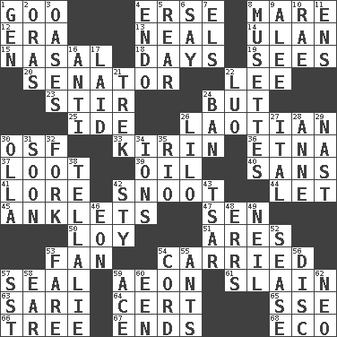 ACROSS 1. Thick or sticky substance 4. Celtic language 8. Female horse 12. Period 13. Actress Patricia 14. ____ Bator, Mongolia 15. Relating to the nose 18. 24-hour periods 19. Perceives with the eye 20. Elected representative 22. Area sheltered from the wind 23. Tumult 24. On the contrary 25. Binary compound 26. Of or relating to Laos or its people 30. Order of Saint Francis (abbr.) 33. Japanese brewing company 36. Inactive volcano in Sicily 37. Plunder 39. Lubricate 40. Without 41. Old wives' tales, e.g. 42. Snob 44. Allow 45. Short socks 47. Elected rep. 50. Myrna of the movies 51. Ancient Greek god of war 53. Air blower 54. Borne 57. Lick closed 59. A really long time 61. Killed 63. Indian skirt 64. Foregone conclusion 65. Compass dir. 66. Woody plant 67. Conclusions 68. Environmental prefix DOWN 1. Commissioned mil. rank 2. Mouths or openings 3. Fertile tracts in a desert 4. Inside; within (prefix) 5. Posterior 6. Declare 7. Raised railways 8. French bagpipes 9. Toward shelter 10. Actress Charlotte 11. Followers of ems 16. Against 17. Put down 21. Long journey 22. Nilotic language 24. Prohibit 26. _ and Stitch 27. Slanted text style (abbr.) 28. Queen of England 1702-14 29. Political cartoonist Thomas 30. Water jar 31. Within a short period 32. Tined utensil 34. Charged atoms 35. River (Sp.) 38. Copy Pinocchio 42. Filthy place 43. Russian ruler of old 46. Period of immesurable duration 48. Blunders 49. Famous astronaut Armstrong 52. Gospel singer Marvin 53. Conductor's collection 54. Drawstring 55. Pismires 56. Flat circle 57. Fast jet (abbr.) 58. Ewer handle 59. Adept person 60. Car or cant ending 62. Modern: prefix