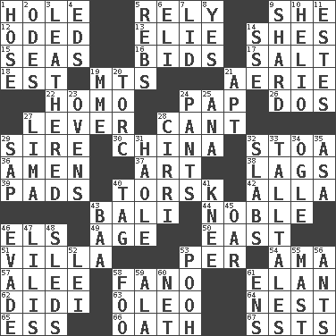 ACROSS 1. Hollow 5. Trust 9. A female animal or person 12. Wrote a lyric poem 13. Writer Wiesel 14. "______ My Girl" (Turtles hit) 15. Oceans 16. Auction offers 17. Table seasoning 18. Eastern Standard Time (abbr.) 19. Mountains (abbr.) 21. Nest on high 22. Like (prefix) 24. Infant food 26. Two (Sp.) 27. Crowbar 28. Patter 29. Male parent of an animal 30. Large country 32. Portico 36. So be it 37. Nonscientific branch of learning 38. Falls behind 39. Writing tablets 40. Cod relative 42. Silent film actress Nazimova 43. Indonesian resort city 44. Impressive in appearance 46. Raised railways 49. Grow older 50. Compass direction 51. Country estate 53. For each 54. Nursemaid (var.) 57. Toward shelter 58. Papal veil 61. Flair 62. "You Light Up My Life" star Conn 63. Butter sub 64. A home for chicks 65. Curvy letter 66. Pledge 67. Fast planes DOWN 1. Stockings 2. Lyric poems 3. Resembling or made to resemble leather 4. Begley and Asner 5. Confederate soldiers (slang) 6. Connecticut Ivy Leaguer 7. Hat (slang) 8. Consenting reply 9. Broken piece 10. Sun: prefix 11. _____ Park, CO 14. Compass dir. 19. Madame (abbr.) 20. Torque (variant) 21. Fitting 23. Baking chambers 24. Leg coverings 25. Santa ___, CA 27. Pale green bean 28. High-altitude cloud 29. Plant excrement 31. White Person, in Hawaii 32. Broad, flat, thick pieces 33. Baron Munchausen's specialties 34. Stare at amorously 35. White ___ sheet 40. Label 41. Leg joint 43. Sound made by sheep 45. Boat paddle 46. Dodge 47. Ms. Damita and namesakes 48. Bobsleighs 52. Luau accessory 53. "Silly old bear" 55. Vertical spar for supporting sails 56. Pismires 58. Egg _ yung 59. Wing 60. Fish or hair follower 61. Followers of ems
