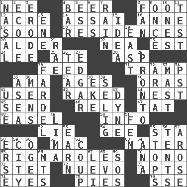 ACROSS 1. Born 4. Fermented drink made from hops 8. 12 inches 12. Land measure 14. Slender Brazilian palm 16. Queen of England 1702-14 17. Within a short period 18. Dwellings 20. Tree or shrub in the Birch family 22. Teachers' org. 23. Eastern Standard Time (abbr.) 24. Area sheltered from the wind 25. Had dinner 28. Viper 30. Nourish 31. _____ steamer (cargo ship) 35. Nanny (var.) 37. Eras 40. Mouths or openings 41. One who uses or employs something 42. Swept the length of 44. Egg locale 45. Transmit 46. Trust 47. Make lace 48. Artist's stand 50. Information 52. Untruth 54. Unit of force equal to gravity 55. R.R. building 58. Environmental prefix 61. Big _ 63. Mother 65. Frustrating wastes of time 70. Words to Nanette 71. Proofreading order 72. New (sp.) 73. Tenement units (abbr.) 74. Sight organs 75. Sliced desserts 76. Compass dir. DOWN 1. Relating to the nose 2. Learning spot: Fr. 3. Wear away 4. Tavern 5. Compass dir. 6. Curvy letter 7. Precipitation 8. Avid follower 9. At one time in the past 10. Washington bills 11. Trial 13. Compass dir. 15. The content of cognition 19. Compass direction 21. Actress Charlotte 26. Pull apart 27. _ Allan Poe 29. Right away 30. Bundle 32. Length times width 33. Vertical spar for supporting sails 34. Pacific Standard Time (abbr.) 35. Toward the sea 36. Not women's 38. Make supply last 39. Major League Baseball Commissioner Bud 41. Purpose 43. Unit of force 49. Pale green bean 51. Opposite of masc. 53. Merit 55. Ceases 56. Portable shelters 57. Came up 58. Celtic language 59. Municipality 60. Double curve, resembling the letter S 62. Overturn; upset 64. Santa ___, CA 66. Mountains (abbr.) 67. Luau accessory 68. First lady 69. Distress signal