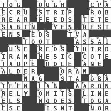 ACROSS 1. Coat; cloak 4. Ending for "Through" and "Enough" 8. Numbers guy (abbr.) 11. Shade of tan 13. Long narrow piece of something 15. Director Reiner 16. Posterior 17. Eats 18. Wig 19. Unit of acoustic absorption 21. It is so 22. Respite 23. Followers of ems 24. Begley and Asner 27. Federal power corp. 29. A blast of a horn 30. Slender Brazilian palm 34. Purpose 36. Vintage cars 39. One of three equal parts 40. SW Asia republic 41. Of or pertaining to a meson 43. ____ d'Azur (French Riviera) 44. Grayish beige 46. Hero or heavy, e.g. 47. A saturated hydrocarbon 48. Tree or shrub in the Birch family 49. Northwest Algerian city 51. Tired old horse 53. R.R. building 54. Chief or king in Benin or Nigeria 57. Adolescent 60. Experiment locale 63. Composer Copland 65. Depend 66. Leaves out 69. Actor's bit 70. Raised railways 71. Methods 72. Ancient Roman robe 73. Compass dir. 74. Is not 75. Not either DOWN 1. Laconic 2. Sea 3. Takes hold of 4. Order of Saint Francis (abbr.) 5. Shoshoni 6. Jennifer or Joel 7. Flintstone garb 8. Algonquian 9. Cooking vessels 10. Collude with 12. RI univ. 14. Inconspicuous attention getter 18. File 13 20. Modern: prefix 25. Dormintory (informal) 26. Bull 28. Large container 29. 3-inch nail 31. The Jewish people; Israel 32. Johnson of "Laugh-In" 33. Binary compound 34. Mountain range 35. Saudi Arabian king (1953-1964) 37. Bear (Spanish) 38. Grain storage towers 40. Call ___ day 42. Certainty 45. Epoch 50. American Automobile Association (abbr.) 52. Take by theft 54. Constellation of myth 55. Beat drum 56. Approach 57. Woody plant 58. Snakelike fish 59. Otherwise 61. Mine, in Marseilles 62. Auction offers 64. Keyboard modifier key 67. Nine, plus one 68. Fast jet (abbr.)