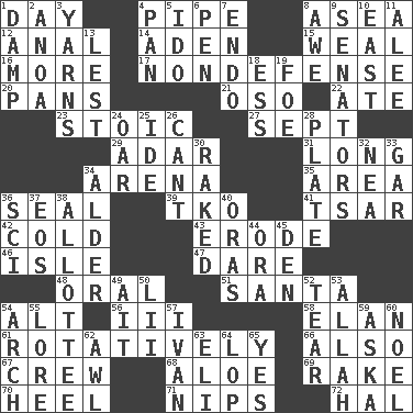 ACROSS 1. 24 hours 4. Corncob 8. Toward the sea 12. Of or related to the anus 14. An important port of Yemen 15. Welt 16. Greater amount 17. Unrelated to defense, as in spending 20. Zero-star reviews 21. Bear (Spanish) 22. Had dinner 23. Unemotional 27. Back-to-school mo. 29. The sixth month of the Jewish calendar 31. Protracted 34. Sports stadium 35. Length times width 36. Lick closed 39. Ring climax 41. Russian ruler of old 42. Lacking warmth 43. Wear away 46. Small island 47. Have the gumption 48. Spoken 51. Before Barbara or Clara 54. The first octave above the treble staff 56. One more than two 58. Style 61. Rotating or pertaining to rotation 66. In addition 67. Ship's personnel 68. Medicinal plant 69. Libertine 70. The bottom of a shoe or boot 71. Pinches, bites 72. Actor Linden DOWN 1. Moist 2. Small Philippine buffalo 3. Tall tales 4. Baking dish 5. Wedding promise 6. Fenced enclosure 7. Inside; within (prefix) 8. Deep reverence 9. Elected representatives 10. 90 degrees 11. Toward shelter 13. For fear that 18. Curvy letter 19. Enemy 24. Rowing implement 25. Binary compound 26. Patter 28. Food holder 30. Moved through 32. Teachers' org. 33. Slender fish 34. Tree or shrub in the Birch family 36. _-fi 37. Greek goddess of the dawn 38. One to whom something is allotted 40. Mouths or openings 44. Mouth or opening 45. Lair 49. Small island 50. Cards in a Roman deck? 52. Lacerate 53. Assad's deity 54. Bowlike part 55. Old wives' tales, e.g. 57. _ the terrible 59. "____ silly question..." 60. Christmas carol 62. Leather borer 63. Biblical high priest 64. Chop off 65. Consenting reply