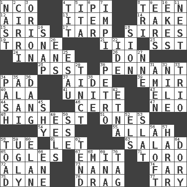 ACROSS 1. Non-commissioned officer (abbr.) 4. Native american tent (variation) 8. Adolescent 12. Wind 13. A distinct part 14. Libertine 15. Indian titles of respect 17. Canvas cover 18. Begets 19. Marketplace scale 21. One more than two 23. Fast jet (abbr.) 24. Empty; void 26. Spanish title 28. Inconspicuous attention getter 30. Pre-World Series prize 34. Groovy apt. 37. Helper 39. Independent ruler or chieftain 40. Wing 41. Join together 43. Connecticut Ivy Leaguer 44. Without 46. Certainty 47. Modern: prefix 48. Having the greatest elevation 51. Singles 54. It is so 55. Assad's deity 58. Third day of the wk. 61. Allow 63. First course 65. Stares 67. Send forth 71. "Corrida" creature 72. Actor Alda or Thicke 73. Grandmother 74. Distant 75. Unit of force 76. To be drawn or hauled along 77. Attempt to accomplish something DOWN 1. Political cartoonist Thomas 2. High-altitude cloud 3. Constellation of myth 4. Teat (slang) 5. Call ___ day 6. For each 7. Body of Kaffir warriors 8. Three (prefix) 9. Hearing organs 10. Makes supply last 11. Egg locale 16. Fastener 18. The Jewish people; Israel 20. Followers of ems 22. Binary compound 25. He sold his birthright 27. Compass dir. 29. A color or tint 30. Stone: prefix 31. So be it 32. Mediterranean tributary 33. Musical group of three 34. Romantic infatuation 35. Mountain range southwest of Kyrgyzstan 36. Mild oath, euphamism for damn 38. Expire 42. Inactive volcano in Sicily 45. Like a shrinking violet 49. Snakelike fish 50. Compass dir. 52. Raised railways 53. Narrow board 56. Upward 57. Ethiopian city, capital of Harari 58. Frog relative 59. Unsightly 60. Enthusiasm 62. Look after 64. Rowboat 66. Compass dir. 68. Impair 69. _ tizzy (2 wds.) 70. Label