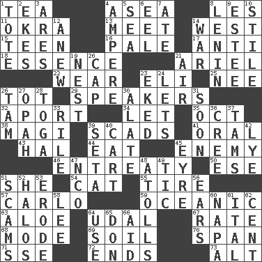 ACROSS 1. Beverage made from leaves 4. At sea 8. French article 11. Gumbo ingredient 13. Rendezvous 14. 270 degrees 15. Adolescent 16. Diluted with white 17. Against 18. Center 21. Satellite of Uranus 22. Put on (as clothing) 23. Biblical high priest 25. Born 26. Small child 29. Orators 32. To the left, to Queeg 34. Allow 35. Sep. follower 38. Wise men 39. Heaps 41. Relating to the mouth 43. Actor Linden 44. Ingest 45. Foe 46. Plea 50. Compass dir. 51. A female animal or person 54. Feline 55. Become fatigued 57. Monte _, Las Vegas Hotel/Casino 59. Pertaining to the sea 63. _ vera 64. Hereditary estate 67. Pace 68. Method 69. The visible part of the earth's surface 70. Connect, as a bridge 71. Compass dir. 72. Conclusions 73. Keyboard modifier key DOWN 1. Carryall 2. Makes supply last 3. Ancient Greek god of war 4. Electrical Unit 5. Ocean 6. Snakelike fish 7. Had dinner 8. Soviet premier 1918-24 9. First name in cosmetics 10. Vertical member of a panel or frame 12. Afresh 14. Armed conflict 19. A home for chicks 20. Head covering 21. Atmosphere 23. Made supply last 24. Allows 26. Scottish cap 27. Brightly colored fish 28. Ancient Roman robe 30. Having winglike extensions 31. Within a short period 33. Cause heat under the collar 36. Algonquian 37. Scottish caps 39. Bristle 40. Draw slowly or heavily 42. Potassium hydroxide 45. Jane of fiction 47. Non-commissioned officer (abbr.) 48. Ringlike coral islands and reefs 49. Nervous spasm 51. Fraudulent business schemes 52. Saint headwear 53. Eat (away) 56. Hearing organs 58. Area sheltered from the wind 60. California wine valley 61. Slanted text style (abbr.) 62. Penny 64. Purpose 65. Spanish title 66. Assist