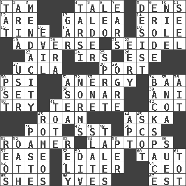 ACROSS 1. Scottish cap 4. Story 8. Lairs 12. "We ___ not amused" (Victoria) 13. An organ shaped like a helmet 14. 4th largest of the Great Lakes 15. Prong on a fork 17. Zeal 18. Not divided or shared with others 19. Contrary to your interests or welfare 21. A glass for beer 23. Atmosphere 24. Big collection agency 26. Compass dir. 27. Southern CA. univ. 28. Sweet dark-red dessert wine 30. Air pressure measure (abbr.) 31. Disorder of the immune system 34. Sound made by sheep 37. Put into a specified state 38. Echolocation 39. Cuckoo 40. Attempt 41. Cylindrical with tapered ends 42. Small bed 43. Wander aimlessly 44. "____ silly question..." 46. Cooking vessel 47. Fast jet (abbr.) 50. Personal Computers (abbr.) 51. Nomad 54. Portable computers 57. Comfort 58. Peak District village in England 60. Pulled tight 62. Von Bismarck 63. 61 cubic inches 64. Corporate head (abbr.) 65. "______ My Girl" (Turtles hit) 66. Jacques Cousteau's middle name 67. Eastern Standard Time (abbr.) DOWN 1. Make lace 2. Operatic vocal solo 3. Ananias' fault 4. Tarsus (plural) 5. Tree or shrub in the Birch family 6. Lion 7. Hearing organs 8. Stop 9. Eat (away) 10. Mediterranean tributary 11. Sew up the eyelids of hawks and falcons 13. Slender fish 16. Tending to cause great harm 20. Period 22. Suggestive of the supernatural 25. Small fatty European fish 27. One who makes use of a thing 29. Legendary monster 30. Pacific Standard Time (abbr.) 31. Toward the sea 32. Typical standards 33. Compass dir. 34. Keyboard key 35. Small Philippine buffalo 36. Small island 41. Lug 43. Lover boys 44. Fitting 45. Native of Scotland 46. Thick mixture 48. Chalkboard 49. Falsehoods 51. Vintage cars 52. Pledge 53. Have trust in 55. For each 56. Takes to court 59. HTML Container Element 61. Small child