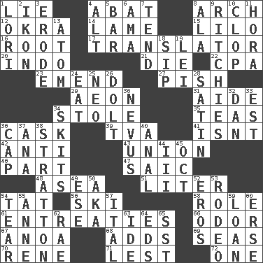 ACROSS 1. Falsehood 4. Blind as ____ 8. Bowlike part 12. Gumbo ingredient 14. Unable to walk 15. _ and Stitch 16. Carrot, for example 17. Interpreter 20. Southeast Asian peninsula 21. Expire 22. Accounting whiz (abbr.) 23. Make improvements or corrections to 27. Expression of disdain 29. A really long time 31. Helper 34. Took without asking 35. Beverages made from leaves 36. Keg 39. Federal power corp. 41. Is not 42. Opposed to 43. The state of being joined or united 46. Component 47. Ketch in the Levant 48. Toward the sea 51. 61 cubic inches 54. Make lace 56. What Jean-Claude Killy likes to do 58. Hero or heavy, e.g. 61. Pleas 66. Aroma 67. Small Philippine buffalo 68. Does sums 69. Oceans 70. French philosopher Descartes 71. For fear that 72. Single DOWN 1. Australian parrot (variant) 2. Picture 3. Wear away 4. The first octave above the treble staff 5. Long, evenly shaped piece 6. Wet nurse (var.) 7. Look after 8. Insect wing 9. Actors Guy, Robert Welles, and Clint 10. Hoof sound 11. Israeli folk dance 13. Smallest unit of an element 18. Small drink 19. Luau accessory 24. Consume 25. Modern: prefix 26. Stupid person 28. Smooth fabric 30. Mole, birthmark 32. One of the 12 tribes of Israel 33. Eastern Standard Time (abbr.) 34. Burlesque acts 36. Head covering 37. Santa ___, CA 38. Ski resort town in Vermont 40. Of or related to the anus 44. One more than two 45. Sep. follower 49. Compass dir. 50. Alias (abbr.) 52. Greek god of love 53. Cowboy competition 54. Separate forcefully 55. Singer Murray 57. Slanted text style (abbr.) 59. Grant temporary use of 60. Celtic language 62. Actress Charlotte 63. Binary compound 64. Begley and Asner 65. Fast jet (abbr.)