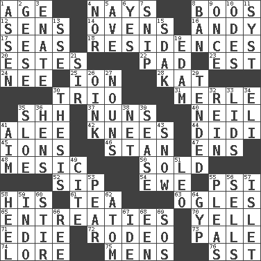 ACROSS 1. Personal question 4. Negative votes 8. Expressions of contempt or scorn 12. Elected reps. 14. Baking chambers 16. "60 Minutes" Commentator Rooney 17. Oceans 18. Homes 20. _____ Park, CO 22. Writing tablet 23. Eastern Standard Time (abbr.) 24. Born 25. Electrically charged atom 28. Krazy ___ of comics 30. Musical group of three 31. Haggard of country music 35. Quiet! 37. Religious women 40. Famous astronaut Armstrong 41. Toward shelter 42. Leg joints 44. "You Light Up My Life" star Conn 45. Charged atoms 46. Comedian Laurel of Laurel & Hardy 47. Followers of ems 48. Mesonic 50. Disposed of to a purchaser 52. Small drink 54. She-sheep 55. 23rd letter of the Greek alphabet 58. Part of HMS, perhaps 61. Beverage made from leaves 63. Stares at amorously 65. Pleas 70. Shout 71. Singer Brickell 72. Cowboy competition 73. Light colored 74. Old wives' tales, e.g. 75. Not women's 76. Fast jet (abbr.) DOWN 1. NE Netherlands city 2. Honkers 3. Related on the mother's side 4. Not either 5. "___ Maria" 6. It is so 7. Sever or remove by pinching or nipping 8. Bar 9. Single time 10. Lyric poems 11. System (abbr.) 13. Compass dir. 15. Neighbor of Neb. 19. Dutch treat 21. Title for a knight 26. Pig sound 27. Parts of speech 29. Looked after 30. College paper 32. It's straight from the horse's mouth 33. Flaplike coverings 34. Biblical high priest 35. _ gin 36. Coop moms 38. Fish or hair follower 39. Gospel singer Marvin 41. Direct toward a target or goal 43. Overwhelm 49. Quote 51. Lion 53. Lightbulb-shaped fruit 55. Entreaties 56. Exchanges for money 57. Small island 58. Person who is morally reprehensible 59. _ china 60. Use a spoon 62. Tiny particle 64. Swindle 66. To sift 67. Binary compound 68. Car or cant ending 69. Distress signal