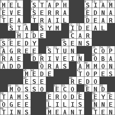 ACROSS 1. Cartoonist voice _ Blanc 4. Staphylococcus 9. Thailand, formerly 13. Night before a holiday 14. Father Junipero _ 15. Pulitzer Prize-winning author Ferber 16. Afternoon social gathering 17. Drop behind 18. Letter starter 19. R.R. building 21. Symbol (abbr.) 22. Perfect 24. Flintstone garb 26. Auto 27. Morally degraded 29. Elected reps. 30. Match 31. Astound 33. Police officer (slang) 36. Actress Charlotte 37. Popular '50s hangout 40. Chief or king in Benin or Nigeria 41. Find the sum of 42. Mouths or openings 43. ID or VA city 45. Ancient Persian 47. Drinks excessively 48. Compass dir. 49. Do over again 50. With motion or animation 52. Environmental prefix 54. Conclusion 56. Scottish caps 57. Eat (away) 59. Sight organ 61. Double curve, resembling the letter S 62. Ms. Damita and namesakes 63. Compass dir. 64. Canisters 65. Intended 66. "___ Little Indians" DOWN 1. Was introduced to 2. Nights before holidays 3. Tough but pliablecoriaceous 4. Fast jet (abbr.) 5. Laconic 6. Like ___ of sunshine 7. Demure 8. Actor Linden 9. Spring feasts 10. It may be bright or harebrained 11. Of or related to the anus 12. Spoil 20. Helper 22. Ancient Celtic tribe of eastern Britain 23. One of the 12 tribes of Israel 25. Colored 27. "Two Mules for Sister ____" 28. Mild oath 29. Takes to court 31. Father 32. Federal power corp. 33. Piece 34. Mitch Miller's instrument 35. Baking dishes 38. Cowboy competition 39. Nathan's nickname 44. Method 45. Makes clutter 46. Curvy letter 49. "The Thinker" sculptor 50. Wise men 51. Presage 52. One of the Great Lakes 53. Root beer relative 55. Centimeter-gram-second unit of force 56. Small child 57. Shade tree 58. Eastern Standard Time (abbr.) 60. Car or cant ending