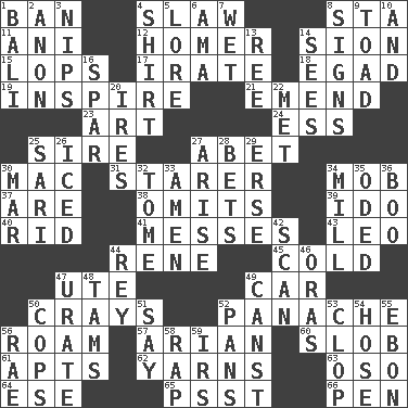 ACROSS 1. Forbid 4. Cole _ (cabbage dish) 8. R.R. building 11. Black tropical American cuckoo 12. Simpsons dad 14. The Jewish people; Israel 15. Chops off 17. Feeling or showing extreme anger 18. Mild oath 19. Stimulate to action 21. Make improvements or corrections to 23. Nonscientific branch of learning 24. Double-curved letter 25. Title for a man of rank and authority 27. Collude with 30. Apple computer (short form) 31. A viewer who gazes fixedly 34. Disorderly crowd 37. "We ___ not amused" (Victoria) 38. Leaves out 39. Wedding promise 40. To free from 41. Makes clutter 43. Lion 44. French philosopher Descartes 45. Having a low temperature 47. Shoshoni 49. Auto 50. Trading vessels 52. Flamboyance 56. Wander aimlessly 57. Believer in; advocate of (suffix) 60. Oscar Madison type 61. Tenement units (abbr.) 62. Tall tales 63. Bear (Spanish) 64. Compass dir. 65. Inconspicuous attention getter 66. Writing instrument DOWN 1. Indonesian resort city 2. At once, immediately (arch.) 3. Cuts off 4. Upper-body garment 5. Old wives' tales, e.g. 6. Housemaid (var.) 7. Dripping 8. Signals 9. Frog relative 10. Plus 13. To separate or throw off 14. Perceives with the eye 16. Practice fight 20. Angers 22. Was introduced to 25. Indian skirt 26. On the rocks 27. Get up 28. Wagers 29. Celtic language 30. Make imperfect 32. Heavy book 33. So be it 34. Place where flour is made 35. Wrote a lyric poem 36. Oct. 31 cry 42. Skim 44. Marina Del _, California 46. Mouths or openings 47. A salt of uric acid 48. Scottish caps 49. 2nd pers. sing. pres. of can (arch.) 50. 911 reaches them 51. Declare 52. Baking dishes 53. Hoof sound 54. Flexible conduit 55. Inky black, to poets 56. Actress Charlotte 58. Hit sharply and swiftly 59. Big collection agency
