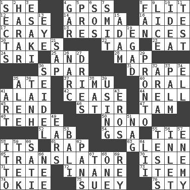 ACROSS 1. A female animal or person 4. Global Positioning Systems (abbr.) 8. Sudden quick movement 12. Relaxation 14. Scent 16. Assistant 17. Supercomputer manufacturer 18. Homes 20. Proceeds 22. Label 23. Ingest 24. _ Lanka 25. Added to 28. Atlas unit 30. Coast Guard woman 31. Window treatment 35. Had dinner 37. Tall New Zealand timber tree 40. Relating to the mouth 41. Jai _ 42. Stop 44. 1994 drama film starring Jodie Foster 45. Tear apart 46. Use a spoon 47. Scottish cap 48. Giggle 50. Words to Nanette 52. Experiment locale 54. Girls' org. (abbr.) 55. Standoff 58. It is 61. Reproach for some lapse or misdeed 63. American astronaut and politician John 65. Interpreter 70. Small island 71. Wig 72. Lacking in sense or substance 73. Detail 74. Migrant worker of the '30s 75. Chop _ 76. Filthy place DOWN 1. Religious groups 2. Ethiopian city, capital of Harari 3. 1973 Nobel Price Winner (Physics) Leo 4. Slender fish 5. Before (prefix) 6. Mayday 7. Stricken, poetically 8. Avid follower 9. Louse (plural) 10. The content of cognition 11. Trial 13. Sight organ 15. First of billions? 19. Mild oath 21. Plant excrement 26. Drug cop 27. Frees from moisture 29. Right away 30. Beer mug 32. Type of rug 33. Inside of hand 34. Pipe bend 35. Toward shelter 36. Hyperbolic tangent 38. Floor protector 39. Exploiting 41. Nonscientific branch of learning 43. Greek god of love 49. Hearing organs 51. Tired old horse 53. Indonesian resort city 55. Trials 56. An arm off of a larger body of water 57. Foe 58. "Tell ____ the Marines!" 59. Long journey 60. Suttee (variant) 62. Baking dishes 64. Cards in a Roman deck? 66. Born 67. The 19th letter of the Greek alphabet 68. Single 69. Marina Del _, California