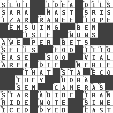 ACROSS 1. Notch 5. The content of cognition 9. Petroleums 13. "Two Mules for Sister ____" 14. Political cartoonist Thomas 15. Indian titles of respect 16. Russian ruler 17. The wife of a rajah (variant) 18. Drink excessively 19. Taking place subsequently 21. Benjamin's nick name 22. Capri or Wight 23. Religious women 24. Deep reverence 27. For each 28. Stakes 29. Makes a sale 31. Egg _ yung 32. "Tell ____ the Marines!" 36. Relaxation 37. "Barney Miller" actor Jack 38. Small bottle 39. Type of rug 40. Pass on 41. Haggard of country music 42. Not this but _ 44. R.R. building 46. Environmental prefix 47. Those people 48. Israeli folk dance 50. Elected rep. 51. Devices for capturing images 54. Play the lead 56. Stay 58. SW Asia republic 60. Travel on or in a vehicle 61. Musical sound 62. Trig term 63. On the rocks 64. Colored 65. 90 degrees DOWN 1. Fast jet (abbr.) 2. Goldbrick 3. NW Algerian seaport 4. Tarsus (plural) 5. More empty; more void 6. Mild oath, euphamism for damn 7. Compass dir. 8. Had dinner 9. Clearly or manifestly demonstrative 10. Metal shackles 11. Mouth edge 12. Compass dir. 17. Cause heat under the collar 20. United States Postal Service (abbr.) 21. On the contrary 23. Modern: prefix 24. At sea 25. Erode 26. Otherwise 28. Surprise greeting 30. Tough but pliablecoriaceous 31. Enemy 33. Hoop that covers a wheel 34. Baby powder 35. Margarine 37. Be seated 40. 24 hours 41. Female horse 43. Layer 44. Cast a shadow over 45. Heavy book 47. Sadhe (variant) 49. Ascend 51. Quote 52. Operatic vocal solo 53. Without 54. _ Lanka 55. Nervous spasm 56. Also 57. Male child 59. Remaining after all deductions
