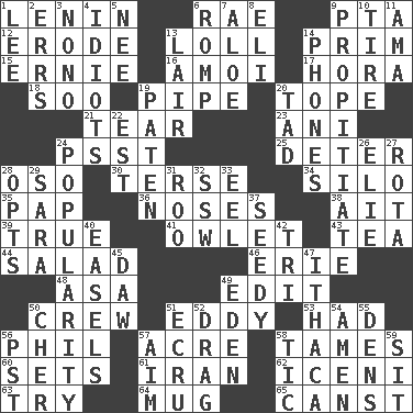 ACROSS 1. Soviet premier 1918-24 6. Actress Charlotte 9. Parent Teacher Assoc. 12. Wear away 13. Hang loosely or laxly 14. Demure 15. Bert's buddy 16. Mine, in Marseilles 17. Israeli folk dance 18. "Barney Miller" actor Jack 19. Corncob 20. Drink excessively 21. Separate forcefully 23. Cuckoo 24. Inconspicuous attention getter 25. Prevent from occurring 28. Bear (Spanish) 30. Laconic 34. Grain storage tower 35. Infant food 36. Olfactory organs 38. Small island 39. Loyal 41. A small or young owl 43. Afternoon social gathering 44. Vegetable dish 46. One of the Great Lakes 48. White ___ sheet 49. Prepare for publication 50. Ship's personnel 51. Whirlpool 53. Possessed 56. Silvers or Donahue 57. 43,560 square feet 58. Domesticates 60. Arranges properly for use 61. SW Asia republic 62. Ancient Celtic tribe of eastern Britain 63. Attempt to accomplish something 64. Java container 65. 2nd pers. sing. pres. of can (arch.) DOWN 1. Area sheltered from the wind 2. Blunders 3. Words to Nanette 4. Foolish or stupid persons 5. Born 6. Play 7. Medicinal plant 8. Connecticut Ivy Leaguer 9. Conciliate 10. Hoop that covers a wheel 11. Nursemaid (var.) 13. Den 14. Gives a jingle 19. Eucharist need 20. Small amount or degree 22. Eastern Standard Time (abbr.) 24. Teen's desire 26. Writer Wiesel 27. Round or rotation of duties 28. Chooses 29. "Two Mules for Sister ____" 31. Friend of Pooh 32. Compass dir. 33. Snakelike fish 37. Shabby and untidy 40. Artist's stands 42. Three (prefix) 45. Obsolete 47. New York city 49. Genesis locale 50. "Mermaids" star 51. Shade of tan 52. To trail on the ground 54. So be it 55. Lairs 56. Pacific Standard Time (abbr.) 57. Direct toward a target or goal 58. Nervous spasm 59. Be seated