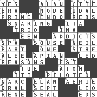 ACROSS 1. Affirmative reply 4. Actor Alda or Thicke 8. Quote 12. Period 13. Method 14. Hereditary estate 15. A-one 18. Inside; within (prefix) 19. Confederate soldiers (slang) 20. Catching in a trap 22. Call ___ day 23. Musical group of three 24. _ tizzy (2 wds.) 25. Car or cant ending 26. Inveterate users 30. Health resort 33. Lush 36. Famous astronaut Armstrong 37. Piece 39. Single 40. The founder of a family 41. Toward shelter 42. Bee-related 44. Directed 45. Thinks logically 47. Eastern Standard Time (abbr.) 50. Third day of the wk. 51. Tiny particle 53. One more than two 54. Manned the helm 57. Drug cop 59. Style 61. Nest on high 63. Relating to the mouth 64. Back-to-school mo. 65. Lion 66. French philosopher Descartes 67. Lick closed 68. Begley and Asner DOWN 1. Slangy assent 2. Blunders 3. Inhabitant of Heaven 4. So be it 5. Yearn 6. Find the sum of 7. Modern: prefix 8. Window treatments 9. The content of cognition 10. Keyboard key 11. Raised railways 16. Female horse 17. 4th largest of the Great Lakes 21. Charged particles 22. Working for oneself (abbr.) 24. Binary compound 26. At sea 27. To provide with a ceiling 28. Hoop that covers a wheel 29. Downhill vehicle 30. Coast Guard woman 31. Diluted with white 32. Type of rug 34. I made a mistake 35. University (slang) 38. A testis 42. A saturated hydrocarbon 43. Actress Patricia 46. Fr. "Yes" 48. Portico 49. Lug 52. Haggard of country music 53. SW Asia republic 54. Dad 55. International (abbr.) 56. Passed on 57. And not 58. "We ___ not amused" (Victoria) 59. Double-curved letter 60. Area sheltered from the wind 62. Greek goddess of the dawn