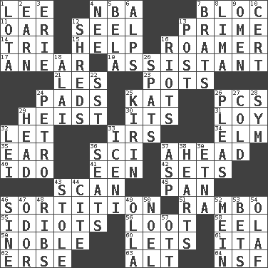 ACROSS 1. Area sheltered from the wind 4. Basketball assoc. 7. Coalition 11. Rowing implement 12. Sew up the eyelids of hawks and falcons 13. A-one 14. Three (prefix) 15. Assist 16. Wanderer 17. Approach 19. Aide 21. French article 23. Plant holders 24. Groovy apts. 25. Krazy ___ of comics 26. Personal Computers (abbr.) 29. Robbery 30. It is 31. Myrna of the movies 32. Allow 33. Big collection agency 34. Shade tree 35. Hearing organ 36. _-fi 37. Having the leading position 40. Wedding promise 41. Car or cant ending 42. Arranges properly for use 43. Examine minutely or intensely 45. Baking dish 46. Casting lots 51. Role for Stallone 55. Foolish or stupid persons 56. Spoils 58. Snakelike fish 59. Impressive in appearance 60. Allows 61. Call ___ day 62. Celtic language 63. Keyboard modifier key 64. Science/research agcy. DOWN 1. Globular water bottle used in Asia 2. Merit 3. One of the Great Lakes 4. Born 5. Actor Lugosi 6. High mountains 7. Naughty children 8. Pale green bean 9. Presage 10. Sure thing 12. Fragments 13. Mail 16. Debaucheries 18. Jai _ 20. Arguments over trivial matters 22. Fast jet (abbr.) 24. Stone: prefix 25. Japanese brewing company 26. Entreaties 27. Chilled 28. Symbol (abbr.) 29. Froth on beer 32. Flowery wreath 33. Ancient Celtic tribe of eastern Britain 36. Theater features 37. Cleo's killer 38. Centers 39. Inactive volcano in Sicily 43. Fur scarf 44. Quote 46. Trig term 47. Aroma 48. Chest bones 49. Water jar 50. Christmas carol 52. Count _ (2 wds.) 53. Antes 54. Norwegian king 57. Baseball player Mel