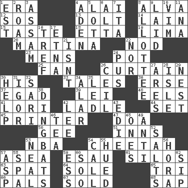 ACROSS 1. Period 4. Jai _ 8. Inventor's middle name 12. Distress signal 13. Dunce 14. (Had) reclined 15. Clothes sense 18. Singer James 19. Pale green bean 20. Chrissie's court nemesis 22. Allow head to fall sleepily 23. Not women's 24. Plant holder 25. Avid follower 26. Window treatment 30. Part of HMS, perhaps 33. Stories 36. Celtic language 37. Mild oath 39. Luau accessory 40. Snakelike fish 41. Australian parrot (variant) 42. Dipping utensil 44. Put into a specified state 45. Hard copy producer 47. ___ good deed 50. Turn to the right 51. Restaurants 53. Basketball assoc. 54. Leopard's kin 57. At sea 59. Son of Isaac 61. Grain storage towers 63. Argument over a trivial matter 64. Not divided or shared with others 65. Three (prefix) 66. Friends 67. Exchanged or delivered for money 68. Plant excrement DOWN 1. Eastern Standard Time (abbr.) 2. Wander 3. Indian state 4. An important port of Yemen 5. Globular water bottle used in Asia 6. The first octave above the treble staff 7. Call ___ day 8. One to whom something is allotted 9. Put down 10. Zeal 11. Santa ___, CA 16. Unclean, religiously 17. Inactive volcano in Sicily 21. Is not 22. And not 24. Product of festering 26. To provide with a ceiling 27. Ancient Greek god of war 28. Small island 29. A home for chicks 30. Aid 31. Russian composer Stravinsky 32. Indian skirt 34. Having or resembling wings 35. Directed 38. Empty-headed or silly people 42. Area sheltered from the wind 43. Singer Brickell 46. Afternoon social gathering 48. Singles 49. Opposed to 52. Table seasonings 53. Anneal 54. Give a ring to 55. Took on color 56. Israeli folk dance 57. Viper 58. Health resort 59. Double-curved letter 60. "Barney Miller" actor Jack 62. Small drink