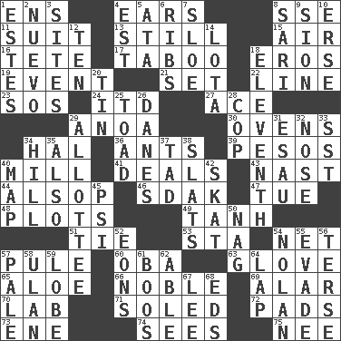 ACROSS 1. Followers of ems 4. Hearing organs 8. Compass dir. 11. Set of matching outer garments 13. Not moving 15. Atmosphere 16. False hair 17. Off limits 18. Greek god of love 19. Happening 21. Put into a specified state 22. Actor's bit 23. Mayday 24. It would 27. Adept person 29. Small Philippine buffalo 30. Baking chambers 34. Actor Linden 36. Pismires 39. Mexican monetary units 40. Place where flour is made 41. Allots cards 43. Political cartoonist Thomas 44. Columnist Joseph or Stewart 46. Neighbor of Neb. 47. Third day of the wk. 48. Small pieces of grounds 49. Hyperbolic tangent 51. Neckwear 53. R.R. building 54. Remaining after all deductions 57. Whimper 60. Chief or king in Benin or Nigeria 63. Michael Jackson trademark 65. Medicinal plant 66. Impressive in appearance 69. Having or resembling wings 70. Experiment locale 71. Having a sole or soles 72. Groovy apts. 73. Compass dir. 74. Perceives with the eye 75. Born DOWN 1. _____ Park, CO 2. New (sp.) 3. Locates 4. Eastern Standard Time (abbr.) 5. "One Day ___ Time" 6. Teases 7. _ gin 8. Indian skirt 9. The Jewish people; Israel 10. Celtic language 12. Nine, plus one 14. Globular water bottle used in Asia 18. Veterans Day date 20. Metal container 25. Frog relative 26. Natives or inhabitants of Denmark 28. Police officer (slang) 29. One to whom something is allotted 31. Son of Isaac 32. Olfactory organ 33. Fast jet (abbr.) 34. Land elevation 35. In addition 37. Bit 38. Narrow boards 40. Atlas unit 42. Three-handed card game 45. 23rd letter of the Greek alphabet 50. Tired old horse 52. Immeasurably long periods of time 54. Pitcher Ryan 55. Elude 56. Laconic 57. Diluted with white 58. Uhlan (variant) 59. Ear part 61. Scornful sounds 62. Competent 64. Pet locale 67. Area sheltered from the wind 68. Begley and Asner