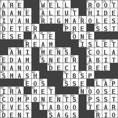 ACROSS 1. "We ___ not amused" (Victoria) 4. Water source 8. Carrot, for example 12. Object of repulsion 14. Native American of Southwest Alaska 16. Flintstone garb 17. _ the terrible 18. Complicated, petty procedures 20. Prevent from occurring 22. Before (prefix) 23. Fast jet (abbr.) 24. Compass dir. 25. Had dinner 28. Single 30. 480, 500 or 516 sheets of paper 31. Small island 35. Black tropical American cuckoo 37. Not women's 40. Root beer relative 41. Dutch treat 42. Scornful expression 44. "This won't hurt ____!" 45. Billionth: prefix 46. Tenth: prefix 47. Portuguese money of account (variant) 48. Box-office sellout 50. Cook's measure (abbr.) 52. Greek goddess of the dawn 54. Compass dir. 55. Pet locale 58. Retirement account (abbr.) 61. Was introduced to 63. Trap for birds or small mammals 65. Parts 70. Inconspicuous attention getter 71. Nights before holidays 72. Off limits 73. Lacerate 74. Gouge 75. Settles 76. _ de Janeiro DOWN 1. Stay 2. All-night dance parties 3. Maternal 4. Armed conflict 5. Connecticut Ivy Leaguer 6. Part of a journey 7. Mass 8. 17th letter of the Greek alphabet 9. Lubricates 10. Lyric poems 11. Trial 13. Compass dir. 15. Pacific island yam 19. Painter Guido (1575-1642) 21. Actress Charlotte 26. Scottish caps 27. Make improvements or corrections to 29. Fortification 30. Full of chinks, cracks, or crevices 32. Ear part 33. Writer Wiesel 34. Make lace 35. First of billions? 36. Nanny 38. Born 39. Religious groups 41. Followers of ems 43. Teases 49. Same (prefix) 51. Elected rep. 53. Emitted 55. Failure 56. Slender Brazilian palm 57. Stone: prefix 58. On the rocks 59. Be footloose 60. So be it 62. Beverages made from leaves 64. Elect 66. Pacific Standard Time (abbr.) 67. Basketball assoc. 68. Coat; cloak 69. Distress signal