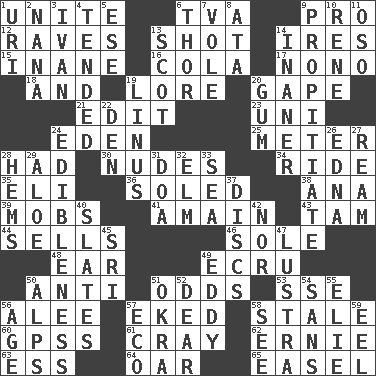ACROSS 1. Join together 6. Federal power corp. 9. Adept person 12. All-night dance parties 13. Opportunity 14. Angers 15. Lacking in sense or substance 16. Root beer relative 17. Words to Nanette 18. Also 19. Old wives' tales, e.g. 20. Open wide 21. Prepare for publication 23. Corn or form start 24. Paradise 25. Distance measurement 28. Possessed 30. Unadorned figures 34. Travel on or in a vehicle 35. Biblical high priest 36. Having a sole or soles 38. Santa ___, CA 39. Disorderly crowds 41. At full speed 43. Scottish cap 44. Exchanges for money 46. Not divided or shared with others 48. Ewer handle 49. Shade of tan 50. Opposed to 51. Probability 53. Compass dir. 56. Toward shelter 57. Supplemented with great effort 58. Having lost freshness 60. Global Positioning Systems (abbr.) 61. Supercomputer manufacturer 62. Bert's buddy 63. Double-curved letter 64. Rowing implement 65. Artist's stand DOWN 1. RI univ. 2. Nanny 3. _ the terrible 4. Looked after 5. Compass dir. 6. Son of Odin 7. Short-tailed, large-bodied rat 8. _ moment's notice (2 wds.) 9. Appease 10. French philosopher Descartes 11. Bear (Spanish) 13. Native of Scotland 14. Sillier 19. "_ and Lucy" (Charlie Brown theme song) 20. Chewing product 22. Lair 24. The property of being fit to eat 26. Pulitzer Prize-winning author Ferber 27. 480, 500 or 516 sheets of paper 28. Equivocates 29. Medicinal plant 31. ___ good deed 32. Shade tree 33. Ocean 37. Plates 40. Chalkboards 42. Not either 45. _ Lanka 47. A period of five years 49. Whirlpool 50. High mountains 51. Gumbo ingredient 52. Letter starter 54. Without 55. Writer Wiesel 56. Personal question 57. Environmental prefix 58. Observe 59. Snakelike fish