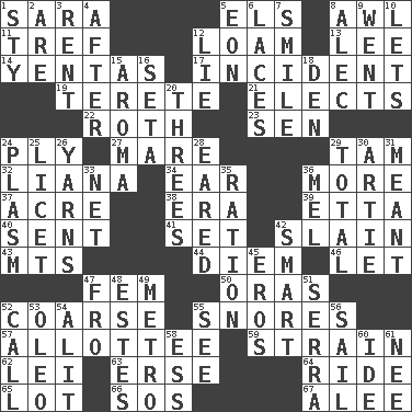 ACROSS 1. "Two Mules for Sister ____" 5. Raised railways 8. Leather borer 11. Unclean, religiously 12. Rich soil 13. Area sheltered from the wind 14. Gossips 17. Event 19. Cigar-shaped 21. Opts 22. Writer of Portnoy's Complaint (1969) 23. Elected rep. 24. Travel a route regularly 27. Female horse 29. Scottish cap 32. Woody, climbing, usually tropical plant 34. Ewer handle 36. Greater amount 37. 1/640 square mile 38. Epoch 39. Singer James 40. Posted 41. Arrange properly for use 42. Killed 43. Mountains (abbr.) 44. South Vietnam president (1954) 46. Allow 47. Opposite of masc. 50. Mouths or openings 52. Rough 55. Sounds asleep 57. One to whom something is allotted 59. Put through a sieve 62. Luau accessory 63. Celtic language 64. Travel on or in a vehicle 65. Car dealer's back yard 66. Mayday 67. Toward shelter DOWN 1. Filthy place 2. "We ___ not amused" (Victoria) 3. Monthly bill 4. Following 5. A really long time 6. Shoestrings 7. Grin 8. Actor Baldwin 9. Left 10. Allows 12. Untruth 15. Scent 16. Bristle 18. Lair 20. Triplets 24. Suffix with ecto or cyto 25. It is permitted: Lat. 26. Entertaining tales 28. Having ears or earlike features 29. "_____ Recall" 30. Nick name for Arthur 31. Intended 33. Fish or hair follower 35. Food allowance for one day 36. Cartoonist voice _ Blanc 42. Don Adams' spy role 45. Greek god of love 47. Back 48. _____ Park, CO 49. Paris' subway 51. Spanish missionary in California 52. Give a ring to 53. Butter sub 54. Set down 55. Perceive with the eye 56. Travel by water 58. Curvy letter 60. Binary compound 61. Born