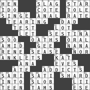 ACROSS 1. Layer 4. Volcanic refuse 8. Play the lead 12. Wedding promise 13. ____ d'Azur (French Riviera) 14. Lacquered or enameled metalware 15. Burn superficially 18. Of or related to the anus 19. Assign a rank or rating to 20. Rending 22. Male parent 23. Trial 24. Car dealer's back yard 25. Allow 26. French poetic form 30. "Barney Miller" actor Jack 33. Expletives 36. Spoken 37. Among 39. Unit of force equal to gravity 40. Grandmother 41. French philosopher Descartes 42. Gospel singer Marvin 44. And not 45. Short socks 47. Krazy ___ of comics 50. Santa ___, CA 51. Nights before holidays 53. Had dinner 54. Inveterate users 57. Indian skirt 59. Suttee (variant) 61. Pottery fragment 63. To the inside or interior of 64. Oscar Madison type 65. Cards in a Roman deck? 66. Adolescent 67. Scottish caps 68. Compass dir. DOWN 1. Part of HMS, perhaps 2. Prepare for publication 3. Music written for nine 4. Skim 5. Protracted 6. "One Day ___ Time" 7. Set 8. Ski resort town in Vermont 9. Frog relative 10. The first octave above the treble staff 11. To separate or throw off 16. Highlander 17. Celtic language 21. "Tell ____ the Marines!" 22. Two (Sp.) 24. French article 26. "______ My Girl" (Turtles hit) 27. SW Asia republic 28. Billionth: prefix 29. Having or resembling wings 30. "Two Mules for Sister ____" 31. Sign of something about to happen 32. Pig sound 34. Matures 35. Beverage made from leaves 38. Accusation by an informer 42. R.R. building 43. Made supply last 46. Compass dir. 48. Deliberation 49. Technical 52. Having lost freshness 53. Johnson of "Laugh-In" 54. Smallest unit of an element 55. Rights 56. Indian titles of respect 57. Be seated 58. One (Scot) 59. Fast jet (abbr.) 60. Insect wing 62. Pass on