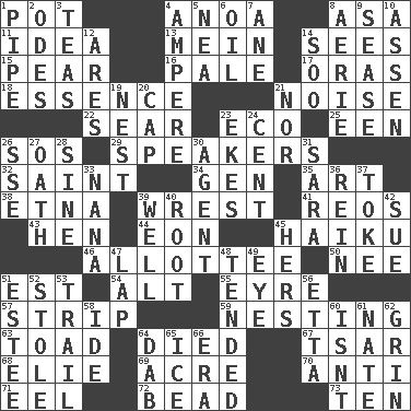 ACROSS 1. Cooking vessel 4. Small Philippine buffalo 8. White ___ sheet 11. It may be bright or harebrained 13. Count _ (2 wds.) 14. Perceives with the eye 15. Lightbulb-shaped fruit 16. Light colored 17. Mouths or openings 18. Substance 21. Annoying sound 22. Burn superficially 23. Environmental prefix 25. Car or cant ending 26. Mayday 29. Orators 32. Inhabitant of Heaven 34. Commissioned mil. rank 35. Tate display 38. Inactive volcano in Sicily 39. Obtain by seizing forcibly or violently 41. Vintage cars 43. Layer 44. Period of immesurable duration 45. Japanese verse 46. One to whom something is allotted 50. Born 51. Eastern Standard Time (abbr.) 54. Keyboard modifier key 55. Jane of fiction 57. Remove all contents or possession from 59. Snuggling 63. Frog relative 64. Passed on 67. Russian ruler of old 68. Writer Wiesel 69. 43,560 square feet 70. Against 71. Snakelike fish 72. Necklace unit 73. Nine, plus one DOWN 1. Corncob 2. Lyric poems 3. Beverages made from leaves 4. Electrical Unit 5. Teachers' org. 6. Lubricate 7. One (Scot) 8. Nest on high 9. Gospel singer Marvin 10. NE Netherlands city 12. Ancient Greek god of war 14. "Barney Miller" actor Jack 19. A home for chicks 20. Head covering 21. And not 23. Makes supply last 24. Penny 26. Compass dir. 27. Pledge 28. Trig term 30. Representative 31. "Two Mules for Sister ____" 33. Grandmother 36. It's straight from the horse's mouth 37. Casino tip 39. Not ill 40. Carrot, for example 42. Take to court 45. Possessive pronoun 47. Infant locale 48. Watched over 49. Sight organ 51. First name in cosmetics 52. Fur scarf 53. Go after with the intent to catch 56. Singer James 58. Binary compound 60. Is not 61. Nathan's nickname 62. Smile widely 64. Small moist lump or mass 65. Frozen water 66. Epoch