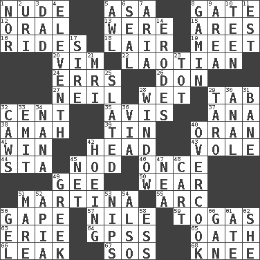 ACROSS 1. Naked 5. White ___ sheet 8. Yard entry 12. Relating to the mouth 13. Past tense of be (plural) 15. Ancient Greek god of war 16. Amusement-park features 18. Den 19. Rendezvous 20. Zeal 22. Of or relating to Laos or its people 24. Blunders 26. Spanish title 27. Famous astronaut Armstrong 28. Dripping 29. Keyboard key 32. Penny 35. Deliberation 37. Santa ___, CA 38. Wet nurse 39. Shallow baking pan 40. Northwest Algerian city 41. Victory 42. Froth on beer 43. Grand slam 44. R.R. building 45. Allow head to fall sleepily 46. At one time in the past 49. Unit of force equal to gravity 50. Erode 51. Chrissie's court nemesis 55. Curve 56. Open wide 57. The longest river in the world 59. Ancient Roman robes 63. 4th largest of the Great Lakes 64. Global Positioning Systems (abbr.) 65. Pledge 66. Path through which fluid escapes 67. Mayday 68. Leg joint DOWN 1. And not 2. RI univ. 3. Male parent 4. Veterans Day date 5. Leather borer 6. Lick closed 7. Operatic vocal solo 8. Street urchin 9. Length times width 10. Adolescent 11. Eastern Standard Time (abbr.) 14. Eats (away) 17. Title for a man of rank and authority 21. Medical imaging device (abbr.) 23. Small child 25. Scheduled 28. Light entry point 29. Pacific island yam 30. Of or related to the anus 31. Object of repulsion 32. Crow sounds 33. Send forth 34. Nanny 36. By way of 40. Burn the roast 42. Cultivating 45. Fish or hair follower 47. Teachers' org. 48. Heavy open wagon 49. Of Greece 51. Female horse 52. Capital of Western Samoa 53. Cuts off 54. In addition 56. Set 58. Curvy letter 60. Separate the seeds from cotton 61. Had dinner 62. A female animal or person