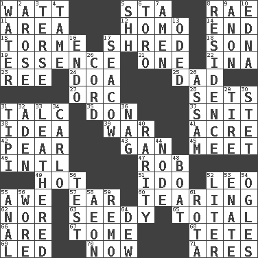 ACROSS 1. Electrical Unit 5. R.R. building 8. Actress Charlotte 11. Type of rug 12. Like (prefix) 14. Conclusion 15. Singer Mel 17. Fragment 18. Boy, to dad 19. Substance 21. Single 22. _ tizzy (2 wds.) 23. To separate or throw off 24. ___ good deed 25. Male parent 27. The grampus (Milton) 28. Puts into a specified state 31. Baby powder 35. Spanish title 37. In a ____ (agitated or irritated) 38. The main thing one is thinking about 39. Armed conflict 41. Measure of real estate 42. Lightbulb-shaped fruit 43. Separate the seeds from cotton 45. Rendezvous 46. International (abbr.) 47. Director Reiner 49. Being at a high temperature 51. Wedding promise 52. Lion 55. Deep reverence 57. Ewer handle 60. Separating forcefully 62. Not either 63. Sleazy 65. "_____ Recall" 66. "We ___ not amused" (Victoria) 67. Heavy book 68. False hair 69. Directed 70. Immediately 71. Ancient Greek god of war DOWN 1. Wetness 2. Came up 3. Laconic 4. Not wild 5. Quiet! 6. "Corrida" creature 7. So be it 8. Home 9. At once, immediately (arch.) 10. Pulitzer Prize-winning author Ferber 13. Wrote a lyric poem 16. Inside; within (prefix) 17. Manatee 20. Drawstring 26. Indian state 29. Become fatigued 30. Proofreading order 31. Native american tent (variation) 32. Arabian gulf 33. Resembling or made to resemble leather 34. Monte _, Las Vegas Hotel/Casino 36. Tired old horse 40. Noteworthy scarcity 44. Thickened enlargement 48. Water vessel 50. Trial 52. 61 cubic inches 53. Related on the mother's side 54. Stares 55. Of or related to the anus 56. Had on 58. Period of immesurable duration 59. San ____ (Riviera town) 61. Roll call or roster of names 64. Morning condensation