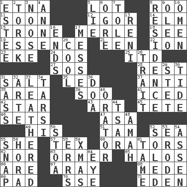 ACROSS 1. Inactive volcano in Sicily 5. Car dealer's back yard 8. Friend of Pooh 11. Within a short period 12. Russian composer Stravinsky 14. Shade tree 15. Heavy duty weighing machine 17. Haggard of country music 18. Observe 19. Substance 21. Car or cant ending 22. Electrically charged atom 23. Supplement with great effort 24. Two (Sp.) 25. It would 27. Mayday 28. Take ten 31. Table seasoning 35. Directed 37. Against 38. Type of rug 39. "Barney Miller" actor Jack 41. On the rocks 42. Play the lead 43. Nonscientific branch of learning 45. Wig 46. Arranges properly for use 47. White ___ sheet 49. Part of HMS, perhaps 51. Scottish cap 52. Ocean 55. A female animal or person 57. John Ritter's dad 60. Speakers 62. And not 63. Abalone 65. Rings 66. "We ___ not amused" (Victoria) 67. Like ___ of sunshine 68. Ancient Persian 69. Writing tablet 70. Compass dir. 71. Genesis locale DOWN 1. First name in cosmetics 2. Cod relative 3. Trap for birds or small mammals 4. Queen of England 1702-14 5. Whopper 6. Legendary monster 7. Lacquered or enameled metalware 8. Home 9. Butter sub 10. Sign of things to come 13. Painter Guido (1575-1642) 16. Extremities 17. Makes clutter 20. Calm and collected 26. Distinguishing feature 29. Proofreading order 30. Event that recurs at intervals 31. Backtalk 32. Johnson of "Laugh-In" 33. Tough but pliablecoriaceous 34. Tarsus (plural) 36. ___ good deed 40. Speaker 44. Russian ruler of old 48. Nursemaid 50. Portico 52. Having a sole or soles 53. Eat (away) 54. NE Netherlands city 55. Fastener 56. Israeli folk dance 58. Blunders 59. Dec. holiday 61. Not wild 64. Sight organ
