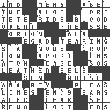 ACROSS 1. Working for oneself (abbr.) 4. Not women's 8. Collude with 12. Third day of the wk. 13. Medicinal plant 14. Australian parrot (variant) 15. False hair 17. Travel on an animal 18. Vital fluid 19. Unconcealed 21. Before (prefix) 23. Compass dir. 24. Constellation of myth 26. Chicken ___ king 28. Mild oath 30. Pulling apart 34. R.R. building 37. Thickened enlargement 39. Riding implement 40. Period of immesurable duration 41. To the left, to Queeg 43. Followers of ems 44. Tiny particle 46. Relaxation 47. Distress signal 48. Cordwainer's material 51. Snakelike fish 54. Elected rep. 55. Annoying sound 58. Santa ___, CA 61. Marina Del _, California 63. Entreaties 65. Citrus fruits 67. Extremities 71. Hearing organs 72. Actor Baldwin 73. Path through which fluid escapes 74. Arrange properly for use 75. Former U.S. Attorney General Janet 76. Farming town in central California 77. Begley and Asner DOWN 1. "Tell ____ the Marines!" 2. New (sp.) 3. Prevent from occurring 4. Third mo. 5. Connecticut Ivy Leaguer 6. Allow head to fall sleepily 7. Ooze 8. 100% 9. Expressions of contempt or scorn 10. Greek god of love 11. Periodic rise and fall of the sea level 16. One of the Great Lakes 18. Actor Lugosi 20. Coat; cloak 22. Actress Charlotte 25. Grandmother 27. Curve 29. Drug addict 30. Laconic 31. Angers 32. Words to Nanette 33. Global Positioning Systems (abbr.) 34. Lick closed 35. Haul 36. Small Philippine buffalo 38. ___ good deed 42. Adolescent 45. Mountains (abbr.) 49. Possessive pronoun 50. Compass dir. 52. Chop off 53. Filth; sediment 56. Gospel singer Marvin 57. Having ears or earlike features 58. Having or resembling wings 59. The longest river in the world 60. So be it 62. Shout 64. Fast planes 66. Environmental prefix 68. Modern: prefix 69. June honoree 70. What Jean-Claude Killy likes to do
