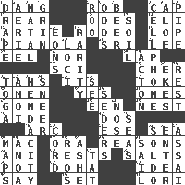 ACROSS 1. Mild oath, euphamism for damn 5. Director Reiner 8. Head covering 11. Tail end 12. Lyric poems 14. Biblical high priest 15. Nick name for Arthur 17. Cowboy competition 18. Chop off 19. Player piano 21. Indian title of respect (Mr.) 22. Area sheltered from the wind 23. Snakelike fish 24. Not either 25. Infant locale 27. _-fi 28. "Mermaids" star 31. Scottish caps 35. ___ a Wonderful Life 37. Puff or smoke 38. Sign of things to come 39. Affirmative reply 41. Singles 42. Went 43. Car or cant ending 45. A home for chicks 46. Helper 47. Two (Sp.) 49. Curve 51. Compass dir. 52. Ocean 55. Apple computer (short form) 57. Mouth or opening 60. Thinks logically 62. Black tropical American cuckoo 63. Musical pauses 65. Table seasonings 66. Plant holder 67. Capital of the state of Qatar 68. It may be bright or harebrained 69. Declare 70. Arrange properly for use 71. Australian parrot (variant) DOWN 1. Window treatment 2. Nest on high 3. Brizilian seaport 4. Broad smile 5. Friend of Pooh 6. Likelihood 7. Fermented drink made from hops 8. Portable communications device 9. _ vera 10. Corncob 13. The visible part of the earth's surface 16. Immeasurably long periods of time 17. Noteworthy scarcity 20. Event scenes 26. 13-14th century defensive garment 29. Makes supply last 30. Take ten 31. Ancient Roman robe 32. Mine, in Marseilles 33. Ananias' fault 34. Scornful expression 36. Perceive with the eye 40. Spring feasts 44. Characteristic smell of wine 48. Oceans 50. Drawstring 52. Twentieth part of a lira 53. Keyboard key 54. Slender Brazilian palm 55. Atlas contents 56. Small Philippine buffalo 58. Vintage cars 59. American tennis player Robert 61. Travel by water 64. Make lace