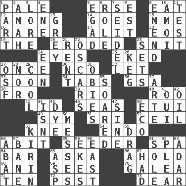 ACROSS 1. Diluted with white 5. Celtic language 9. Erode 12. Amid 14. Leaves 15. Madame (abbr.) 16. More uncommon 17. Came down and settled, as after flight 18. Greek goddess of the dawn 19. Definite Article 20. Eaten away 23. In a ____ (agitated or irritated) 24. Sight organs 25. Supplemented with great effort 27. Single time 30. Non-commissioned officer (abbr.) 32. Allow 33. Within a short period 34. Bar bills 36. Girls' org. (abbr.) 38. From 39. _ de Janeiro 40. Friend of Pooh 43. Hat (slang) 46. Oceans 48. Needle case 49. Symbol (abbr.) 51. _ Lanka 52. To provide with a ceiling 53. Leg joint 54. Inside; within (prefix) 56. "This won't hurt ____!" 58. Sowing specialist 61. Health resort 64. Soap unit 65. "____ silly question..." 66. Hold, grip (Informal) 68. Cuckoo 69. Observes 70. An organ shaped like a helmet 71. Nine, plus one 72. Inconspicuous attention getter 73. Letter starter DOWN 1. Role in a play 2. Housemaid 3. Old wives' tales, e.g. 4. Compass dir. 5. Mild oath 6. Hero or heavy, e.g. 7. A glass for beer 8. Eastern Standard Time (abbr.) 9. Make improvements or corrections to 10. Mine, in Marseilles 11. Trial 13. Jennifer or Joel 21. Monthly bill 22. Motion picture awards 23. Arranges properly for use 24. Car or cant ending 26. Barrel 27. Order of Saint Francis (abbr.) 28. Not either 29. Calm and collected 31. Off-Broadway awards 35. Flew 37. Johnson of "Laugh-In" 41. Fr. "Yes" 42. Lubricate 44. Is not 45. Color 47. Trig term 48. Environmental prefix 50. Makes clutter 53. Japanese brewing company 55. To be drawn or hauled along 56. Blind as ____ 57. Object of repulsion 59. Supplements with great effort 60. Compass direction 61. Flatfish 62. Entreaty 63. The sixth month of the Jewish calendar 65. Viper 67. Possessed