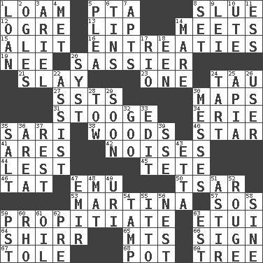 ACROSS 1. Rich soil 5. Parent Teacher Assoc. 8. Turn sharply 12. Legendary monster 13. Mouth edge 14. Confronts 15. Came down and settled, as after flight 16. Pleas 19. Born 20. More lively and spirited 21. Kill 23. Single 24. The 19th letter of the Greek alphabet 27. Fast planes 30. Atlas contents 31. Moe Howard, for one 34. One of the Great Lakes 35. Indian skirt 38. Forest 40. Play the lead 41. Ancient Greek god of war 42. Annoying sounds 44. For fear that 45. Wig 46. Make lace 47. Australian flightless bird 50. Russian ruler of old 53. Chrissie's court nemesis 57. Mayday 59. Appease 63. Needle case 64. Bake eggs in their shells 65. Mountains (abbr.) 66. Signal 67. Lacquered or enameled metalware 68. Cooking vessel 69. Woody plant DOWN 1. Grant temporary use of 2. Stares at amorously 3. Satellite of Uranus 4. Was introduced to 5. Entreaty 6. Airtight sealed metal containers 7. Tenement units (abbr.) 8. Arrange properly for use 9. Flowery wreath 10. Shoshoni 11. Curvy letter 14. Female horse 17. _ de Janeiro 18. Car or cant ending 20. System (abbr.) 22. Help 24. Small pie 25. Capital of Western Samoa 26. One who makes use of a thing 28. Pull behind 29. Within a short period 30. Makes clutter 32. Thick or sticky substance 33. Prepare for publication 35. Table seasoning 36. Type of rug 37. Relief 39. Compass dir. 43. Singer James 47. Independent ruler or chieftain 48. Floor protector 49. RI univ. 51. Having gotten out of bed 52. Makeup applied to the cheeks 54. Pack (down) 55. "Tell ____ the Marines!" 56. A home for chicks 58. Trig term 59. Pacific Standard Time (abbr.) 60. 17th letter of the Greek alphabet 61. Lubricate 62. Before (prefix) 63. Eastern Standard Time (abbr.)