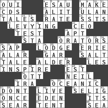 ACROSS 1. Fr. "Yes" 4. He sold his birthright 8. Create 12. Music discs 13. Came down and settled, as after flight 14. ____ Bator, Mongolia 15. Falsehoods 18. Assign a rank or rating to 19. Fast planes 20. Imposing or collecting, as a tax 22. Corporate head (abbr.) 23. Trial 24. Fitting 25. R.R. building 26. Speakers 30. Plant excrement 33. Cabin 36. 4th largest of the Great Lakes 37. Having or resembling wings 39. Slender fish 40. Table seasoning 41. Lie 42. Tree or shrub in the Birch family 44. French article 45. Motivate 47. Eastern Standard Time (abbr.) 50. Baseball player Mel 51. Famous astronaut Armstrong 53. Retirement account (abbr.) 54. Pertaining to the sea 57. Do not 59. Not recorded 61. Former Milwaukee Brewers owner Bud 63. Single time 64. Genesis locale 65. It is 66. Dry up 67. Portable shelter 68. Ocean DOWN 1. Sep. follower 2. Allodial 3. Small island 4. Merit 5. Volcanic refuse 6. Small island 7. Shoshoni 8. French bagpipes 9. In addition 10. Krazy ___ of comics 11. Followers of ems 16. Nights before holidays 17. System (abbr.) 21. Slanted text style (abbr.) 22. Tax preparer (abbr.) 24. "We ___ not amused" (Victoria) 26. Legendary monster 27. Taken by mouth 28. Cause heat under the collar 29. Arranges properly for use 30. Suttee (variant) 31. Actor Alda or Thicke 32. Friends 34. Stare 35. June honoree 38. News announcer 42. Nonscientific branch of learning 43. French philosopher Descartes 46. Call ___ day 48. Oceans 49. Prong on a fork 52. Ms. Damita and namesakes 53. South American Indian 54. Baking chamber 55. Penny 56. Quote 57. Two (Sp.) 58. Single 59. Allow 60. Binary compound 62. Girls' org. (abbr.)