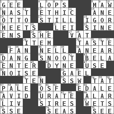 ACROSS 1. Turn to the right 4. Chops off 8. Informal term for the mouth 11. Political cartoonist Thomas 13. Value system 15. One (Scot) 16. "Beetle Bailey" pooch 17. Not moving 18. Russian composer Stravinsky 19. Confronts 21. Luau accessory 22. Trig term 23. Followers of ems 24. A female animal or person 27. Large container 29. A distinct part 30. Clothes sense 34. Air blower 36. 1994 drama film starring Jodie Foster 39. Approach 40. Mild oath, euphamism for damn 41. Snout, nose 43. Actor Lugosi 44. Keyboard key 46. Centimeter-gram-second unit of force 47. Purpose 48. Annoying sound 49. Highlander 51. "___ Little Indians" 53. Compass dir. 54. Make lace 57. Light colored 60. Order of Saint Francis (abbr.) 63. Peak District village in England 65. Enthusiastic 66. A salt of uric acid 69. Having or resembling wings 70. 54 in ancient Rome 71. Fathers 72. Moistens 73. Compass dir. 74. Oceans 75. Perceive with the eye DOWN 1. Dwarf 2. Consumed 3. _____ Park, CO 4. French article 5. Baseball player Mel 6. Silvers or Donahue 7. Drop; flow; fall 8. Wise men 9. At once, immediately (arch.) 10. Past tense of be (plural) 12. Small child 14. 154 in Roman numerals 18. Byzantium, centuries later 20. Fast jet (abbr.) 25. Coop moms 26. Make improvements or corrections to 28. _ moment's notice (2 wds.) 29. Swallowed 31. Perceives with the eye 32. Lie 33. Epoch 34. Papal veil 35. Opposed to 37. Myrna of the movies 38. Yearns 40. Lair 42. Beverages made from leaves 45. To riddle 50. She-sheep 52. Good sense 54. Stories 55. Having winglike extensions 56. Laconic 57. Friends 58. Advice 59. Moving, as bait 61. Indian titles of respect 62. Conductor's collection 64. Obsolete 67. Afternoon social gathering 68. Double-curved letter