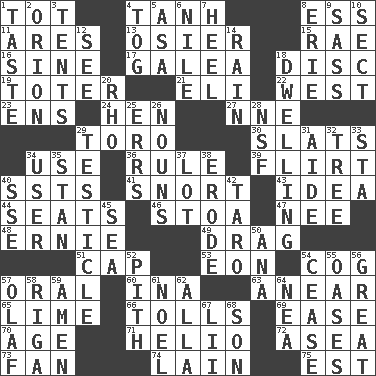 ACROSS 1. Small child 4. Hyperbolic tangent 8. Double-curved letter 11. Ancient Greek god of war 13. Flexible twig of a willow tree 15. Actress Charlotte 16. Trig term 17. An organ shaped like a helmet 18. Plate 19. Carrier 21. Connecticut Ivy Leaguer 22. Compass direction 23. Followers of ems 24. Layer 27. Compass dir. 29. "Corrida" creature 30. Narrow boards 34. Purpose 36. General guideline 39. Seductive woman who exploits men 40. Fast planes 41. Derisive sound 43. It may be bright or harebrained 44. Theater features 46. Portico 47. Born 48. Bert's buddy 49. To draw with force 51. Head covering 53. Period of immesurable duration 54. Gear tooth 57. Relating to the mouth 60. _ tizzy (2 wds.) 63. Approach 65. Citrus frut 66. For Whom the Bell _____ 69. Relaxation 70. Personal question 71. Sun: prefix 72. Toward the sea 73. Air blower 74. (Had) reclined 75. Eastern Standard Time (abbr.) DOWN 1. Clothes sense 2. Constellation of myth 3. Portable shelters 4. Coat; cloak 5. White ___ sheet 6. Mediterranean tributary 7. Person who is morally reprehensible 8. 4th largest of the Great Lakes 9. Backtalk 10. Religious group 12. Observe 14. Precipitation 18. Home 20. 17th letter of the Greek alphabet 25. Blunders 26. Parts of speech 28. Science/research agcy. 29. One of the two male reproductive glands 31. Assistant 32. Woody plant 33. R.R. building 34. One who uses or employs something 35. Comedian Laurel of Laurel & Hardy 37. Car dealer's back yard 38. Eat (away) 40. Compass dir. 42. Edible starchy tuberous root 45. Ocean 50. Santa ___, CA 52. Essential or central part 54. Desist 55. Fertile tracts in a desert 56. Relatively large 57. Norwegian king 58. Port city in Latvia 59. So be it 61. Christmas carol 62. Silent film actress Nazimova 64. Teachers' org. 67. Cards in a Roman deck? 68. Manchild