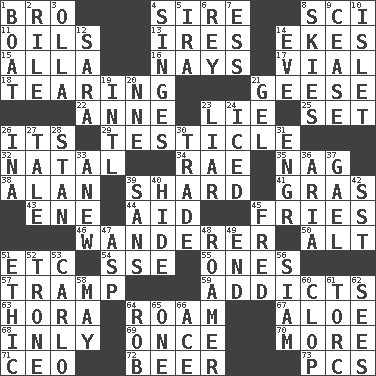 ACROSS 1. Sis' sibling 4. Male parent of an animal 8. _-fi 11. Lubricates 13. Angers 14. Makes supply last 15. Silent film actress Nazimova 16. Negative votes 17. Small bottle 18. Lacerating 21. Honkers 22. Singer Murray 23. Whopper 25. Arrange properly for use 26. ___ a Wonderful Life 29. A testis 32. Relating to or accompanying birth 34. Actress Charlotte 35. Tired old horse 38. Actor Alda or Thicke 39. Broken piece 41. Pate de foie ____ 43. Compass dir. 44. Assist 45. Strips of potato fried in deep fat 46. Roamer 50. The first octave above the treble staff 51. And so on (abbr.) 54. Compass dir. 55. Washington bills 57. _____ steamer (cargo ship) 59. Inveterate users 63. Israeli folk dance 64. Wander aimlessly 67. _ vera 68. In an inward manner 69. Single time 70. Greater amount 71. Corporate head (abbr.) 72. Fermented drink made from hops 73. Personal Computers (abbr.) DOWN 1. Water vessel 2. Cause heat under the collar 3. Rounded earthenware pot or jar 4. Scorches 5. Lyricist Gershwin 6. Marina Del _, California 7. Curvy letter 8. Atmospheres 9. Stop 10. Small island 12. "Two Mules for Sister ____" 14. First lady 19. International (abbr.) 20. Compass dir. 21. Set 23. One who doesn't tell the truth 24. On the rocks 26. _ tizzy (2 wds.) 27. Falsehood 28. Comedian Laurel of Laurel & Hardy 30. Swap 31. Engineer (abbr.) 33. Afresh 36. Roberta Peters solo 37. Highlander 39. Without 40. Flintstone garb 42. Fast jet (abbr.) 45. Flintstone 47. Viper 48. Nomad 49. Conclusion 51. Moral principle 52. Heavy duty weighing machine 53. Monte _, Las Vegas Hotel/Casino 56. Thailand, formerly 58. Fifth month 60. Hoof sound 61. Torque (variant) 62. Perceives with the eye 64. Director Reiner 65. Single 66. Adept person