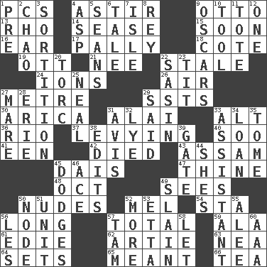 ACROSS 1. Personal Computers (abbr.) 4. Having gotten out of bed 9. Von Bismarck 13. 17th letter of the Greek alphabet 14. Gospel singer Marvin 15. Within a short period 16. Ewer handle 17. Friendly 18. ____ d'Azur (French Riviera) 19. Baseball player Mel 21. Born 22. Having lost freshness 24. Charged particles 26. Atmosphere 27. Distance measurement (Brit.) 29. Fast planes 30. N. Chile seaport 31. Jai ____ 33. The first octave above the treble staff 36. River (Sp.) 37. Imposing or collecting, as a tax 40. "Barney Miller" actor Jack 41. Car or cant ending 42. Passed on 43. Indian state 45. Raised platform 47. One or ones belonging to thee 48. Sep. follower 49. Perceives with the eye 50. Unadorned figures 52. Cartoonist voice _ Blanc 54. R.R. building 56. Yearn 57. Add up to 59. Wing 61. Singer Brickell 62. Nick name for Arthur 63. Teachers' org. 64. Puts into a specified state 65. Intended 66. Afternoon social gathering DOWN 1. Before (prefix) 2. US Secretary of Labor Elaine L. _ 3. Making a chance decision by using lots 4. Cleo's killer 5. Seines 6. Story 7. Capri or Wight 8. Marina Del _, California 9. Motion picture awards 10. Instrument 11. Carry 12. Single 20. Torque (variant) 22. Indian antelope 23. Teat (slang) 25. Anneal 27. Female horse 28. One of the Great Lakes 29. Alleged 31. Advice 32. Potassium hydroxide 33. Aide 34. Grant temporary use of 35. Heavy book 38. Proofreads 39. Yard entry 44. "______ My Girl" (Turtles hit) 45. Evades 46. Adept person 49. Killed 50. Connecting point 51. A single undivided whole 52. Greater amount 53. Singer James 55. Toward shelter 56. French article 57. Scottish cap 58. Allow 60. American Automobile Association (abbr.)