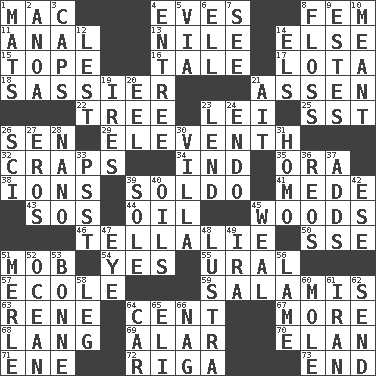 ACROSS 1. Apple computer (short form) 4. Nights before holidays 8. Opposite of masc. 11. Of or related to the anus 13. The longest river in the world 14. Otherwise 15. Drink excessively 16. Falsehood 17. Globular water bottle used in Asia 18. More impudent 21. NE Netherlands city 22. Woody plant 23. Flowery wreath 25. Fast jet (abbr.) 26. Elected rep. 29. Veterans Day date 32. Dice game 34. Indiana (abbr.) 35. Mouth or opening 38. Charged atoms 39. Twentieth part of a lira 41. Ancient Persian 43. Distress signal 44. Petroleum 45. Forest 46. Copy Pinocchio 50. Compass dir. 51. Crowd into 54. Affirmative reply 55. Mountain range 57. Learning spot: Fr. 59. Deli grouping 63. French philosopher Descartes 64. Penny 67. Greater amount 68. Austrian-born American filmmaker Fritz 69. Having or resembling wings 70. Liveliness 71. Compass dir. 72. Port city in Latvia 73. Conclusion DOWN 1. Floor protectors 2. Small Philippine buffalo 3. Balmoral and tarboosh 4. Main course 5. By way of 6. Pipe bend 7. Observe 8. Soft thread for cleaning between teeth 9. _____ Park, CO 10. Intended 12. For fear that 14. Raised railways 19. Angers 20. Snakelike fish 21. Small island 23. Grant temporary use of 24. Inside; within (prefix) 26. _-fi 27. Greek god of love 28. Billionth: prefix 30. Country estate 31. Same (prefix) 33. Inconspicuous attention getter 36. Vintage cars 37. Sums up 39. Not divided or shared with others 40. Lubricates 42. Compass dir. 45. Welt 47. Sight organ 48. A period of five years 49. Lyricist Gershwin 51. Haggard of country music 52. Sea 53. Maid-servant 56. Unable to walk 58. Part of a journey 60. Undercover agent 61. SW Asia republic 62. Post 64. Automobile 65. Biblical high priest 66. Tired old horse