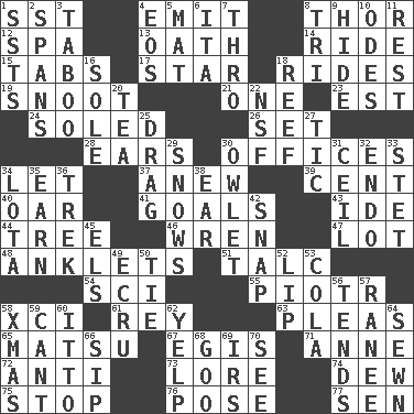 ACROSS 1. Fast jet (abbr.) 4. Give off 8. Son of Odin 12. Health resort 13. Pledge 14. Travel on an animal 15. Bar bills 17. Play the lead 18. Amusement-park features 19. Snout, nose 21. Single 23. Eastern Standard Time (abbr.) 24. Having a sole or soles 26. Put into a specified state 28. Hearing organs 30. Places of business 34. Allow 37. Afresh 39. Penny 40. Boat paddle 41. Finish lines 43. Binary compound 44. Family _ (genealogy) 46. Songbird 47. Car dealer's back yard 48. Short socks 51. Baby powder 54. _-fi 55. Peter (Polish) 58. One more than ninety 61. Marina Del _, California 63. Entreaties 65. Taiwanese island in East China Sea 67. The front part of a cuirass 71. Singer Murray 72. Opposed to 73. Old wives' tales, e.g. 74. Morning condensation 75. Cease 76. Introduce or present, as a question 77. Elected rep. DOWN 1. Fast planes 2. Connects, as a bridge 3. Off limits 4. Greek goddess of the dawn 5. Floor covering 6. Call ___ day 7. Through, poetically 8. Three (prefix) 9. Flintstone garb 10. Lyric poems 11. Take ten 16. Not divided or shared with others 18. Coral ridge 20. Afternoon social gathering 22. Overdraft (abbr.) 25. To be drawn or hauled along 27. Nervous spasm 29. Overwhelms 30. A small or young owl 31. To provide with a ceiling 32. Inside; within (prefix) 33. Proofreading order 34. Globular water bottle used in Asia 35. Merit 36. Long journey 38. Hearing organ 42. Fastener 45. Raised railways 49. Shade of tan 50. Neckwear 52. Mouth edge 53. Root beer relative 56. Watches over 57. Indian princess (variant) 58. Dec. holiday 59. Patter 60. "Tell ____ the Marines!" 62. Sharp bark 64. Stitched 66. Small drink 68. Thick or sticky substance 69. Big collection agency 70. Observe