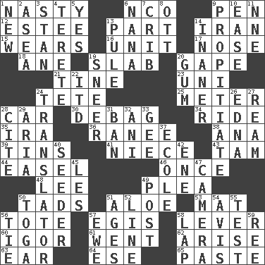 ACROSS 1. Characterized by obscenity 6. Non-commissioned officer (abbr.) 9. Animal enclosure 12. First name in cosmetics 13. Role in a play 14. SW Asia republic 15. Puts on (as clothing) 16. A single undivided whole 17. Olfactory organ 18. One (Scot) 19. Broad, flat, thick piece 20. Stare wonderingly 21. Prong on a fork 23. University (slang) 24. Wig 25. Distance measurement 28. Automobile 30. Debunk (Brit. slang) 34. Travel on or in a vehicle 35. Lyricist Gershwin 36. The wife of a rajah (variant) 38. Santa ___, CA 39. Airtight sealed metal containers 41. Sibling's daughter 43. Scottish cap 44. Artist's stand 46. Single time 48. Area sheltered from the wind 49. Entreaty 50. Small amounts or degrees 51. _ vera 53. Floor covering 56. Carry 57. Armor plate that protects the chest 58. Prying instrument 60. Composer Stravinsky 61. Gone 62. Originate 63. Ewer handle 64. Compass dir. 65. Thick mixture DOWN 1. ___ Haven, CT 2. Toward the sea 3. Comedian Laurel of Laurel & Hardy 4. Cylindrical with tapered ends 5. Affirmative reply 6. Nanny 7. Baby bed with high sides 8. Baseball player Mel 9. Appease 10. Comfort 11. Compass dir. 13. Whimper 14. More lacking in sense or substance 19. Scornful expression 20. Chewing product 22. It would 24. Interpreter 26. Pulitzer Prize-winning author Ferber 27. 480, 500 or 516 sheets of paper 28. Quote 29. Operatic vocal solo 31. Prohibit 32. Cuckoo 33. Turn to the right 37. Learning spot: Fr. 40. Sowing specialist 42. Compass dir. 45. French article 47. Device for capturing images 49. Mail 50. Ancient Roman robe 51. Eons 52. Actor's bit 54. Opinion 55. Trial 56. Neckwear 57. She-sheep 58. Infant locale 59. To sift
