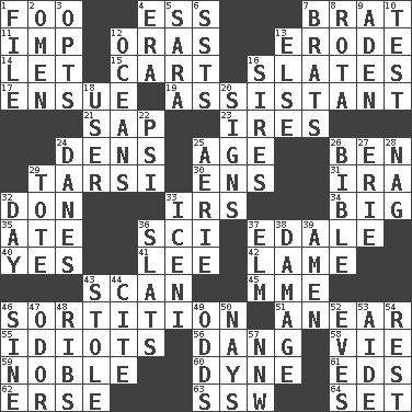 ACROSS 1. Egg _ yung 4. Double-curved letter 7. Naughty child 11. Mischievous child 12. Mouths or openings 13. Eat (away) 14. Allow 15. Haul 16. Chalkboards 17. Follow as a consequence or result 19. Helper 21. Plant excrement 23. Angers 24. Hiding places for outlaws 25. Mature 26. Benjamin's nick name 29. Tarsus (plural) 30. Followers of ems 31. Retirement account (abbr.) 32. Spanish title 33. Big collection agency 34. Of large size 35. Had dinner 36. _-fi 37. Peak District village in England 40. It is so 41. Area sheltered from the wind 42. Unable to walk 43. Examine minutely or intensely 45. Madame (abbr.) 46. Decision 51. Approach 55. Foolish or stupid persons 56. Mild oath, euphamism for damn 58. Compete 59. Having high moral qualities 60. Unit of force 61. Begley and Asner 62. Celtic language 63. Compass dir. 64. Put into a specified state DOWN 1. Do some clerical work 2. Sign of something about to happen 3. Chooses 4. Period 5. "Two Mules for Sister ____" 6. Fast planes 7. Naughty children 8. Round or rotation of duties 9. An important port of Yemen 10. Trial 12. Seas 13. Otherwise 16. Male parents of animals 18. One who uses or employs something 20. Attaches a signature 22. 23rd letter of the Greek alphabet 24. Natives or inhabitants of Denmark 25. Nest on high 26. Instruction Manual for Humans 27. 4th largest of the Great Lakes 28. Tired old horse 29. Haul 32. 24 hours 33. Ancient Celtic tribe of eastern Britain 36. Narrow boards 37. Shade tree 38. Break 39. So be it 43. Took without asking 44. Quote 46. Trig term 47. Scent 48. Teases 49. Probability 50. Negative votes 52. Nights before holidays 53. Assistant 54. Respite 57. Compass dir.